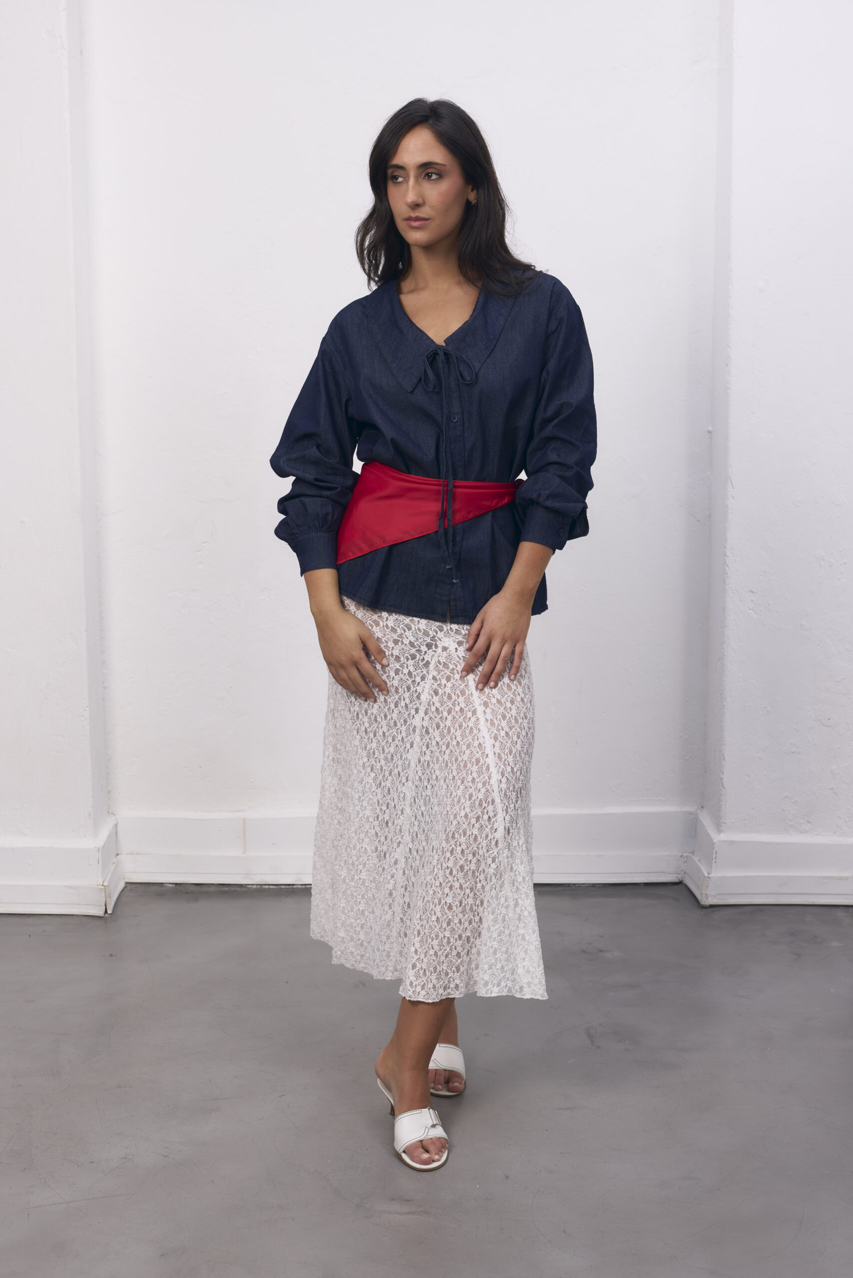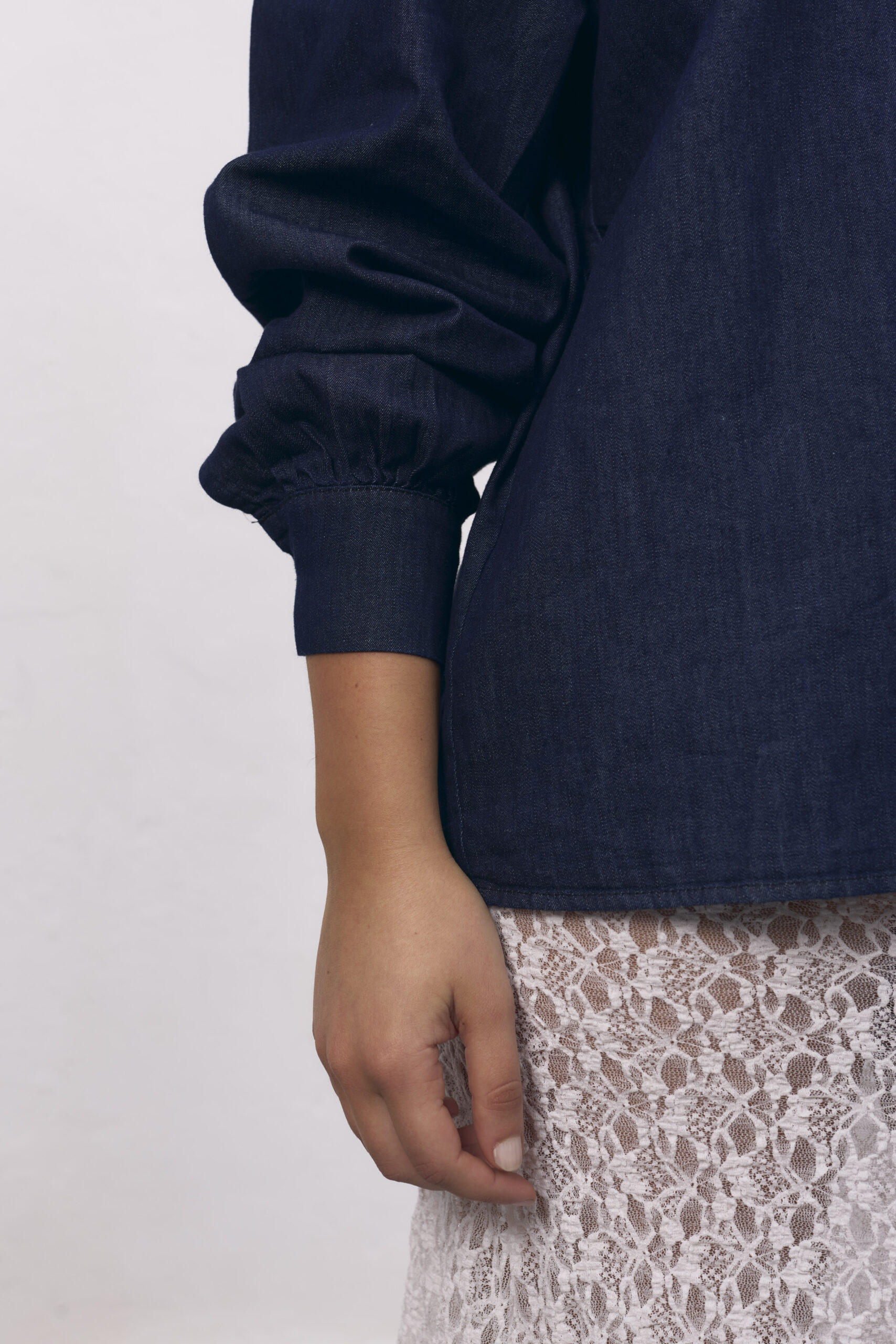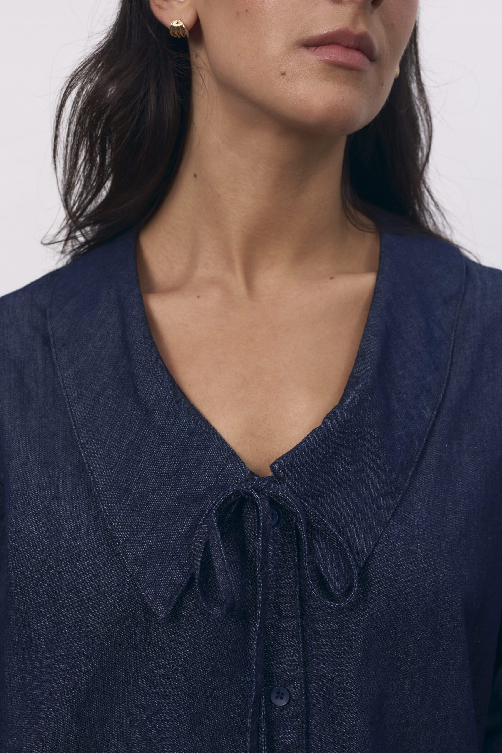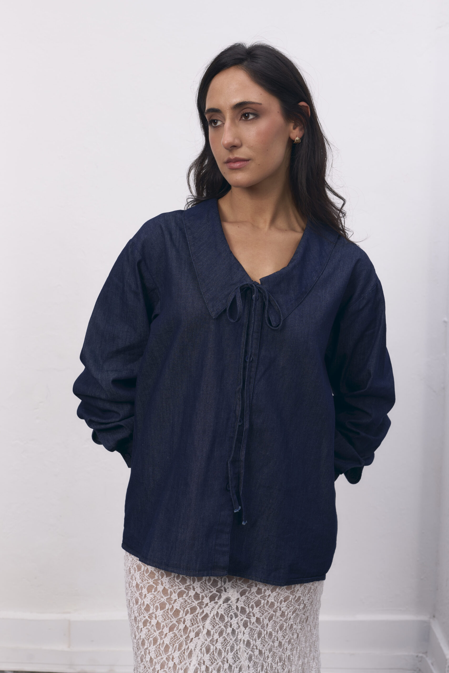 Camisa de jean azul, manga larga, con cuello babé y botones.
