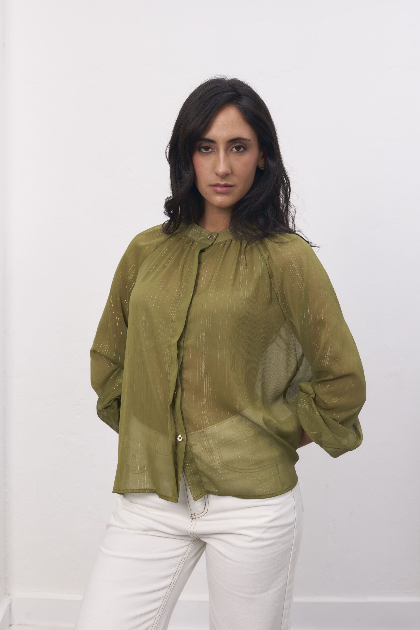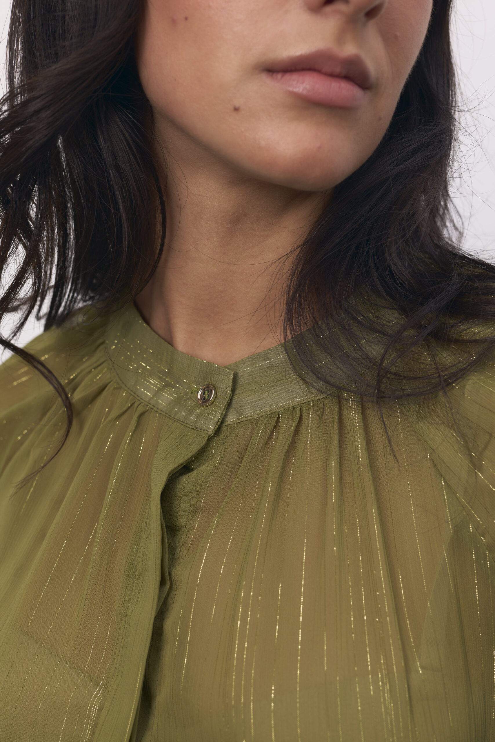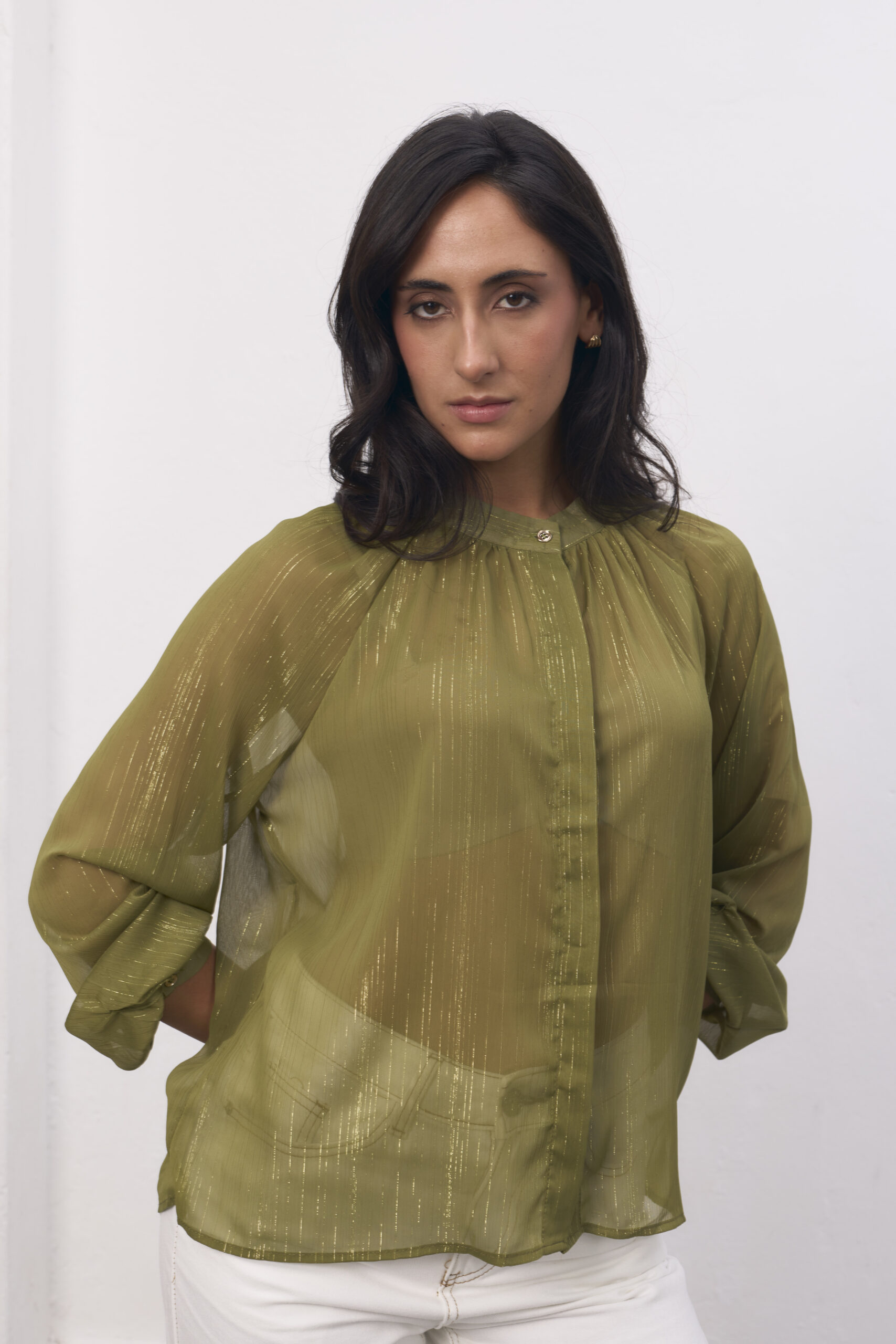 Camisa verde, traslucida, cuello mao, destellos en dorado.