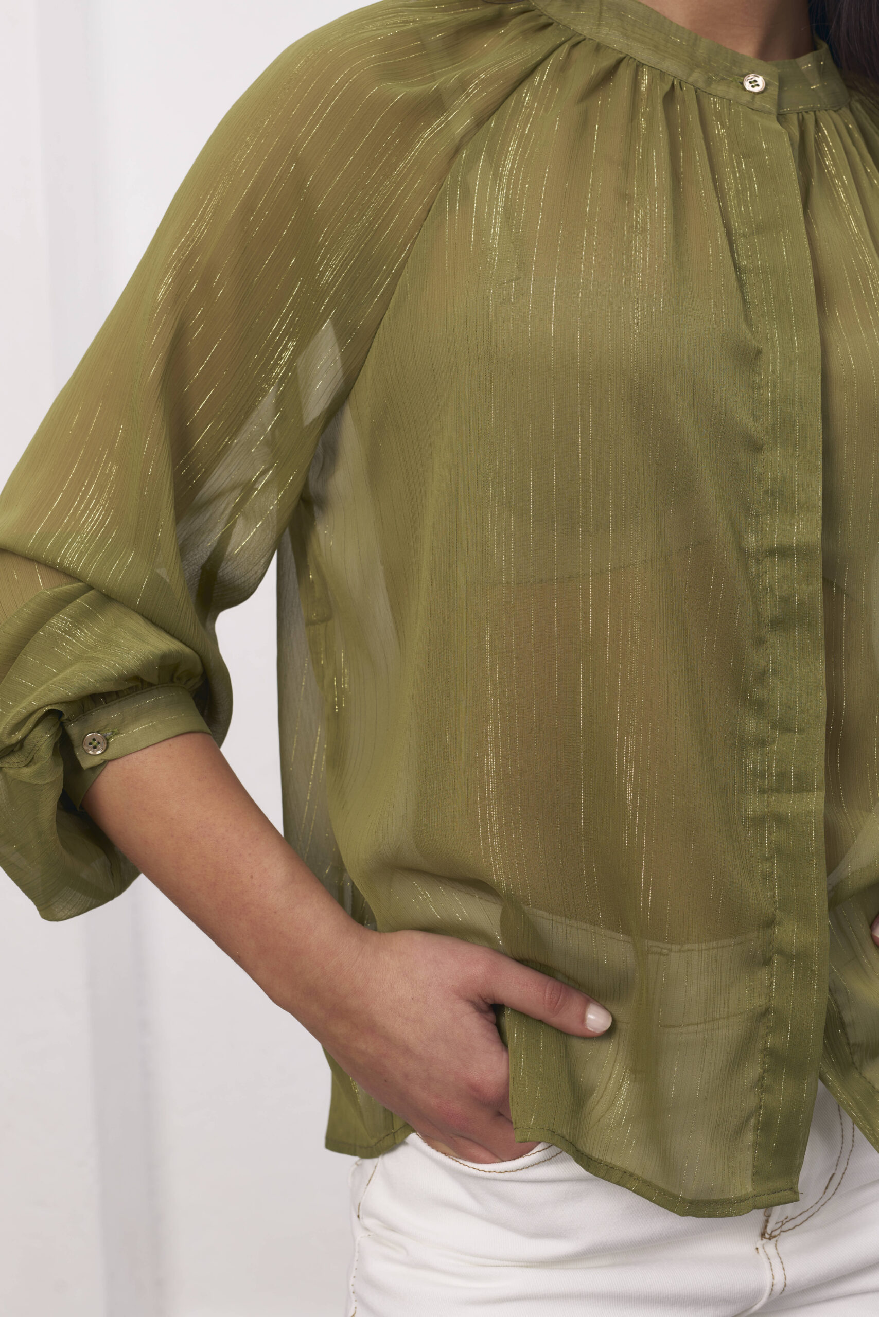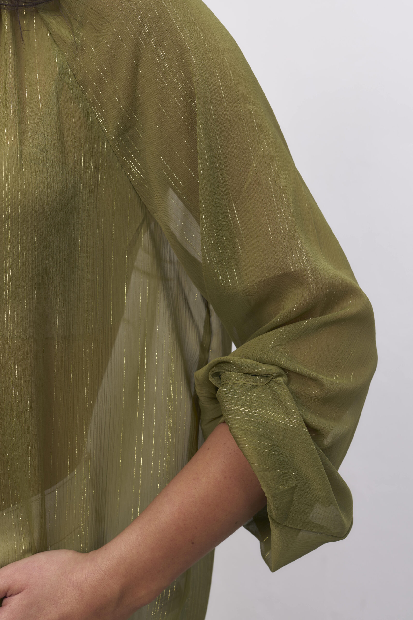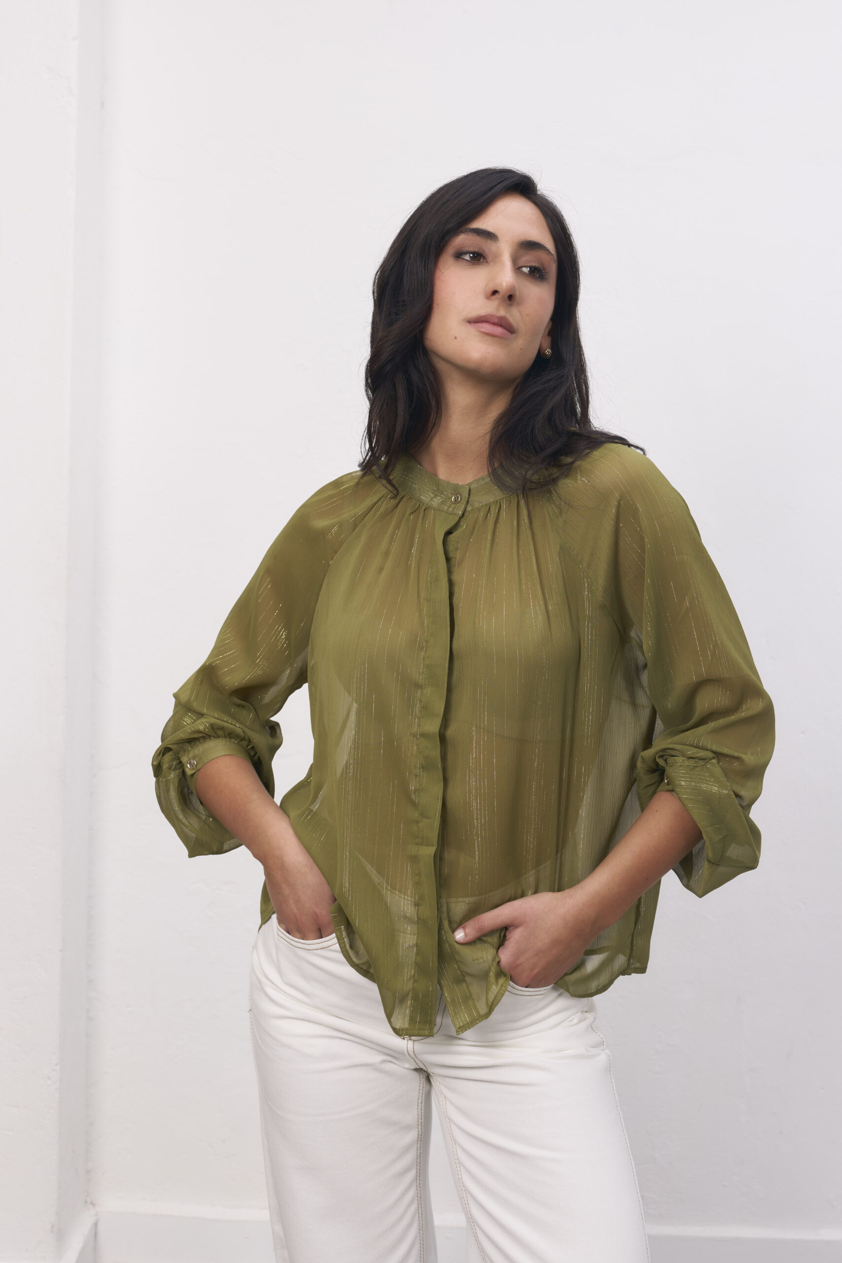Camisa verde, traslucida, cuello mao, destellos en dorado.