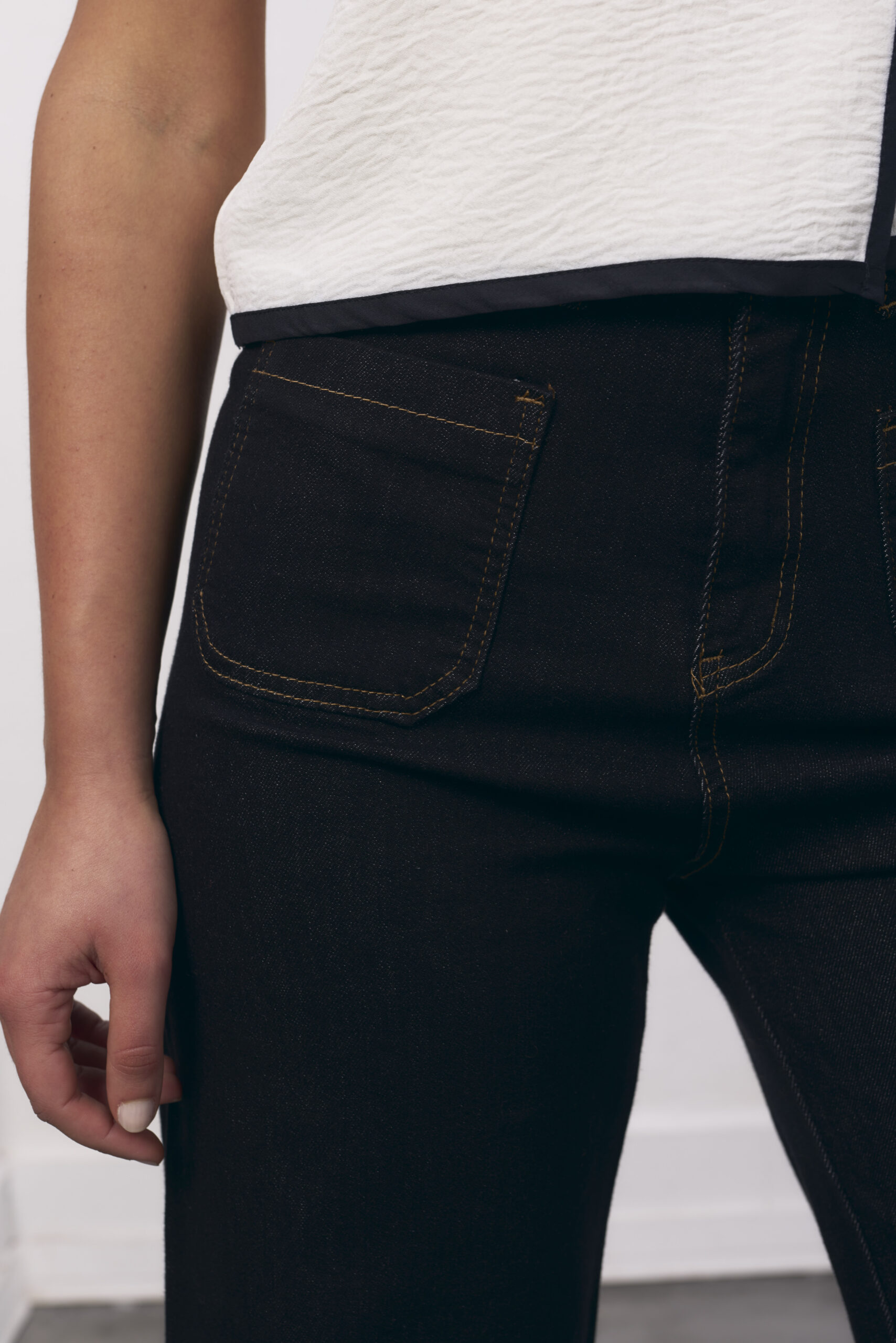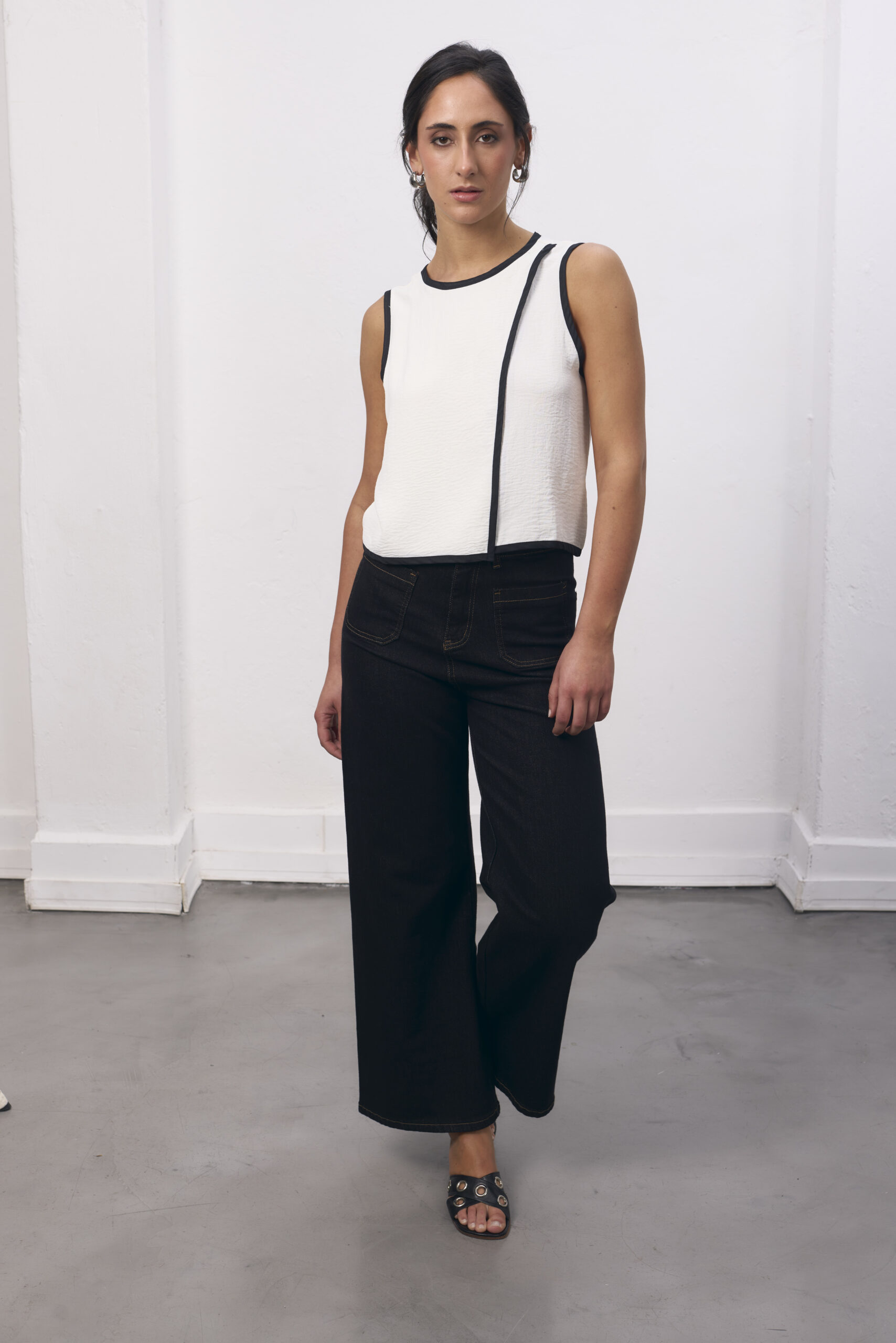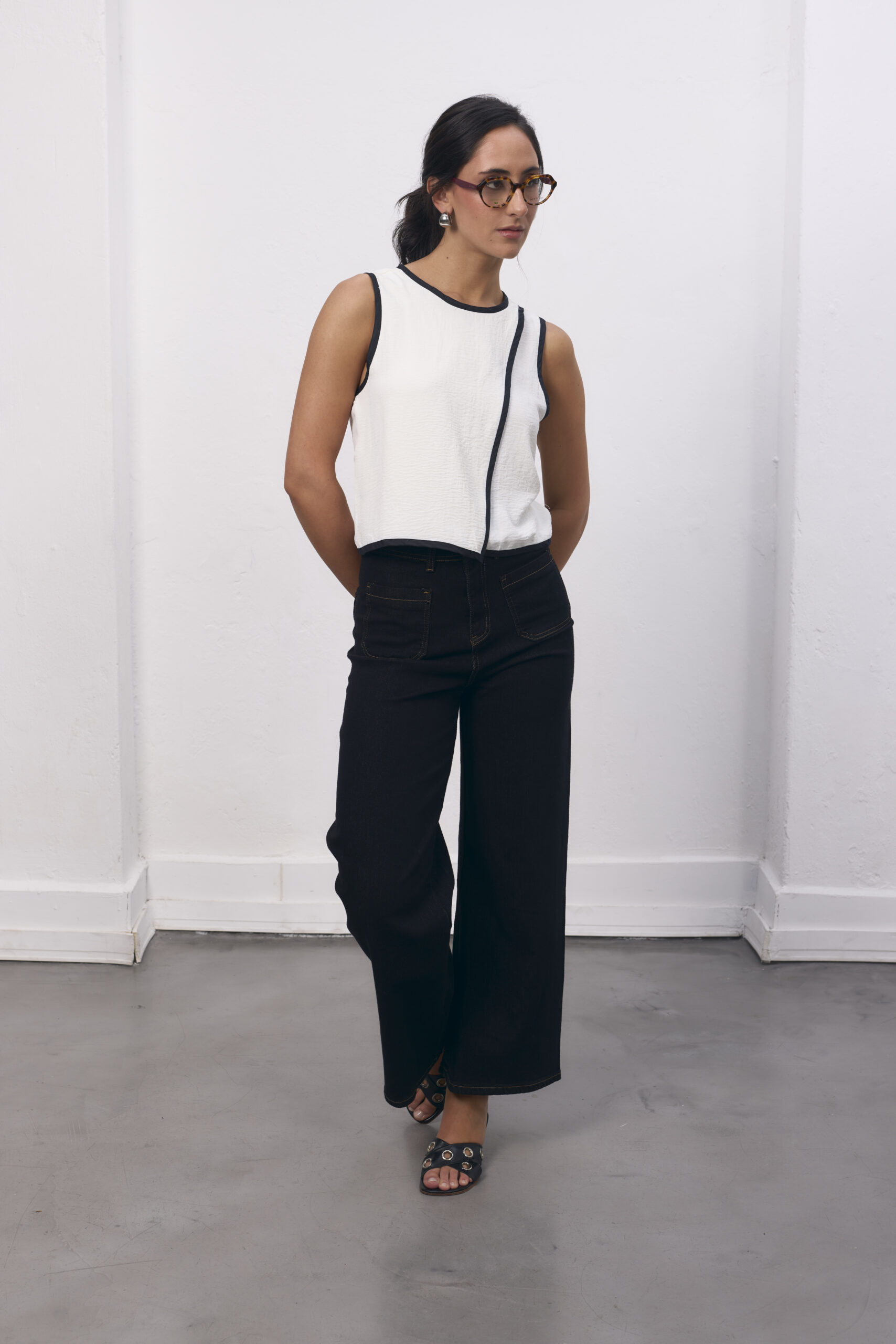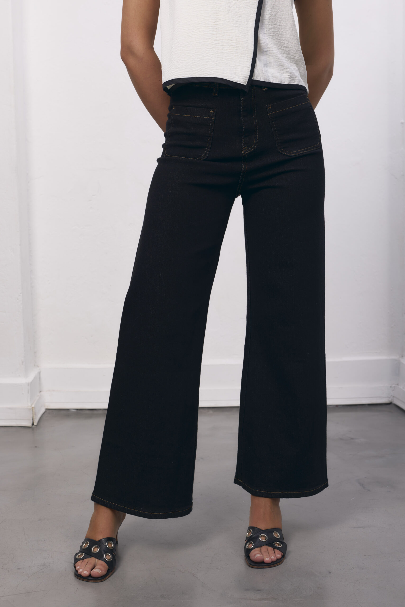 Jean negro tiro alto, recto con bolsillos delanteros.