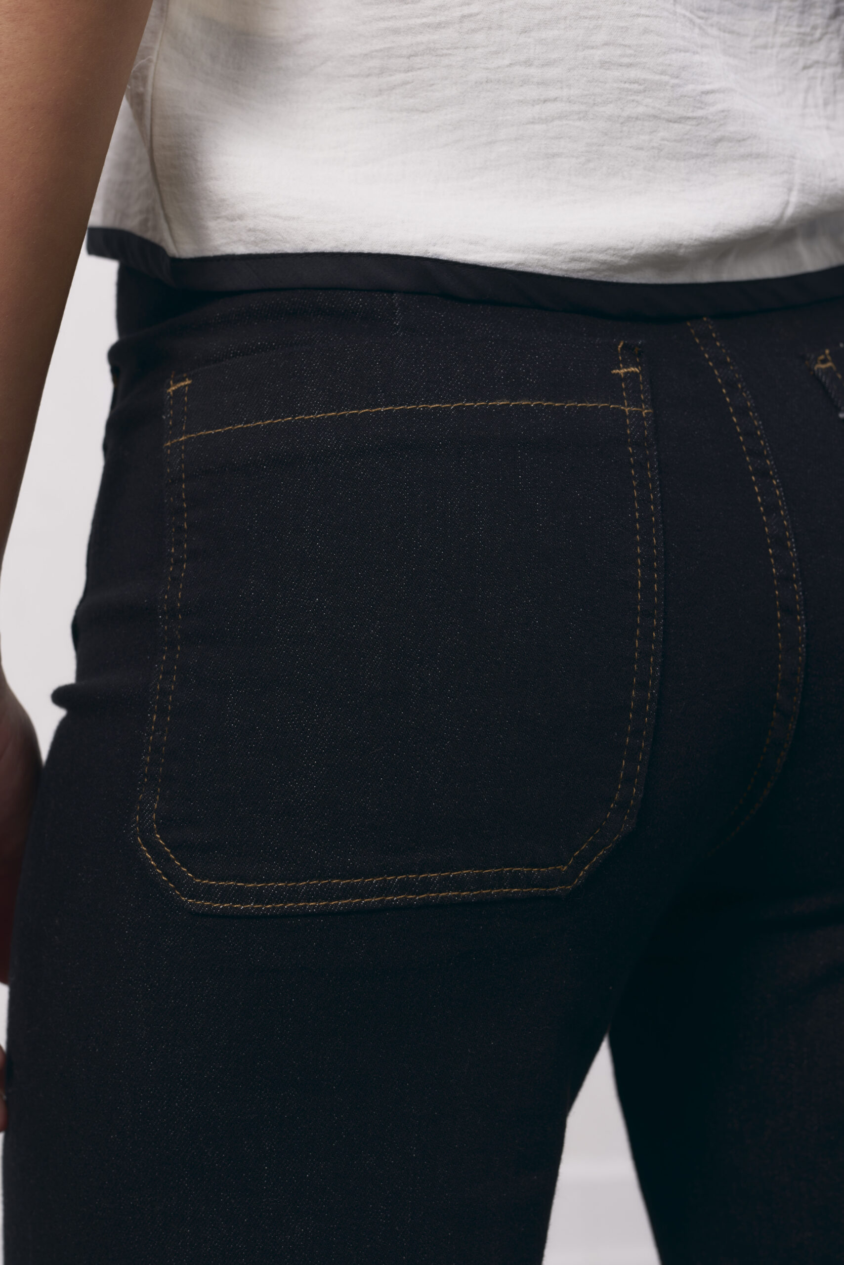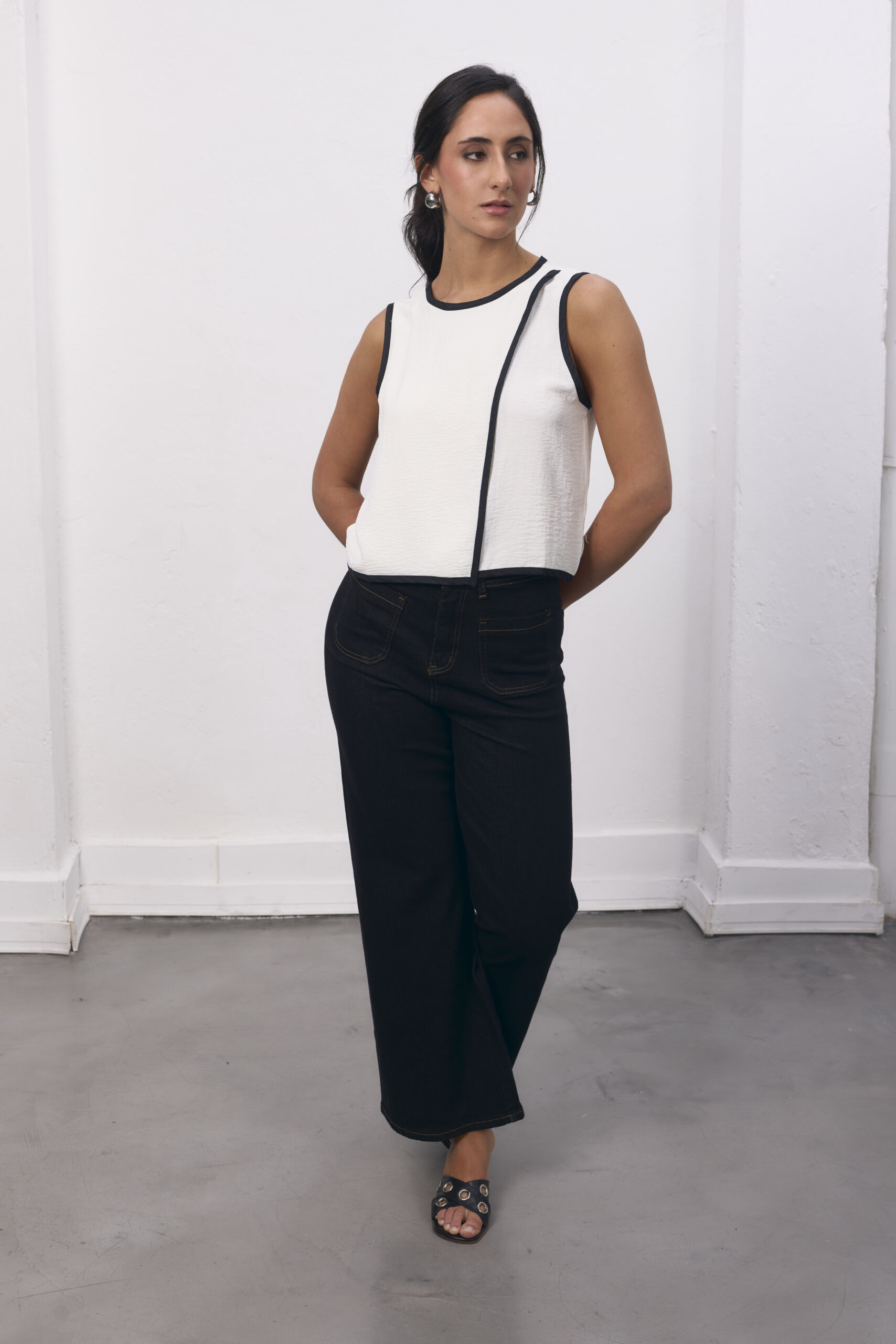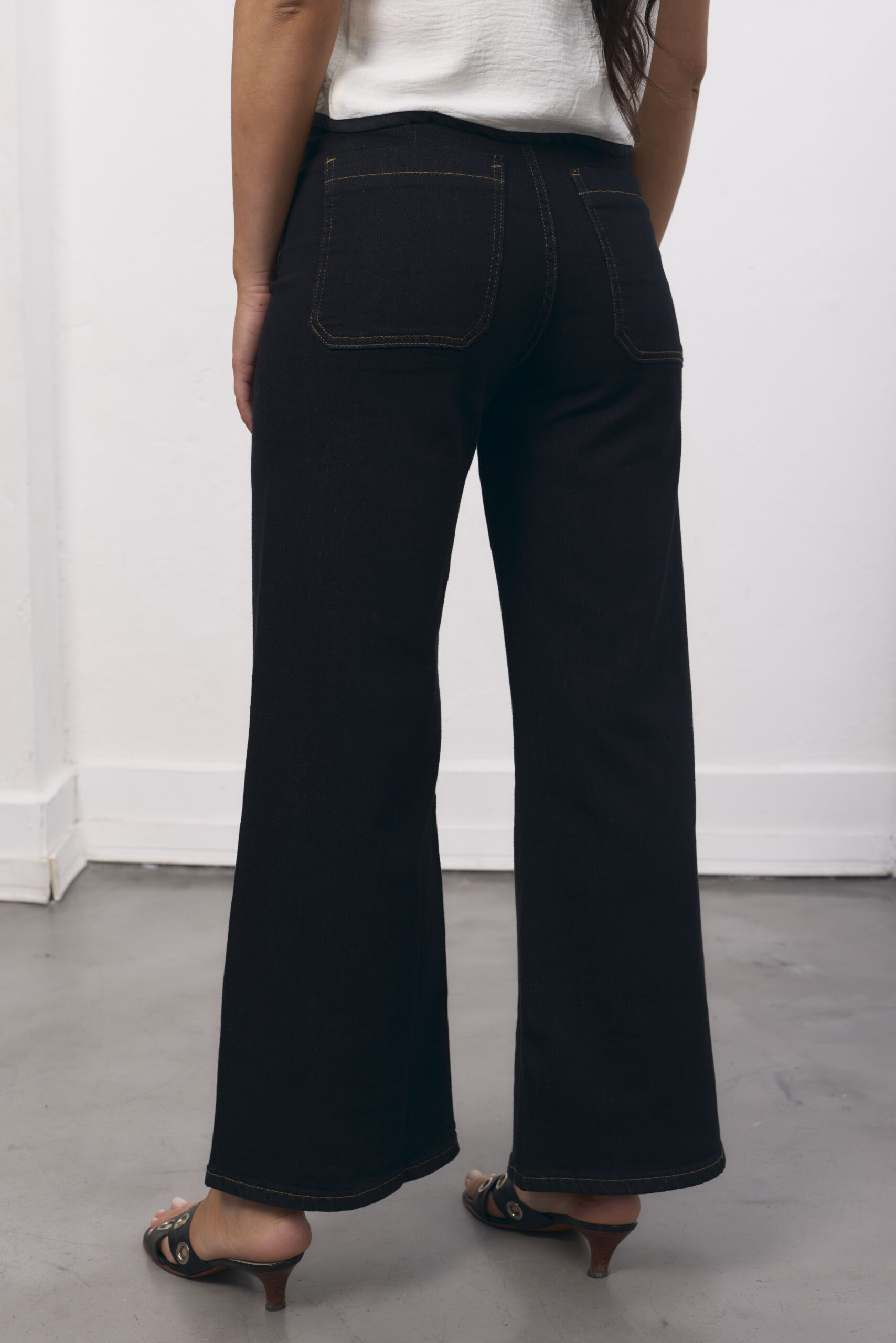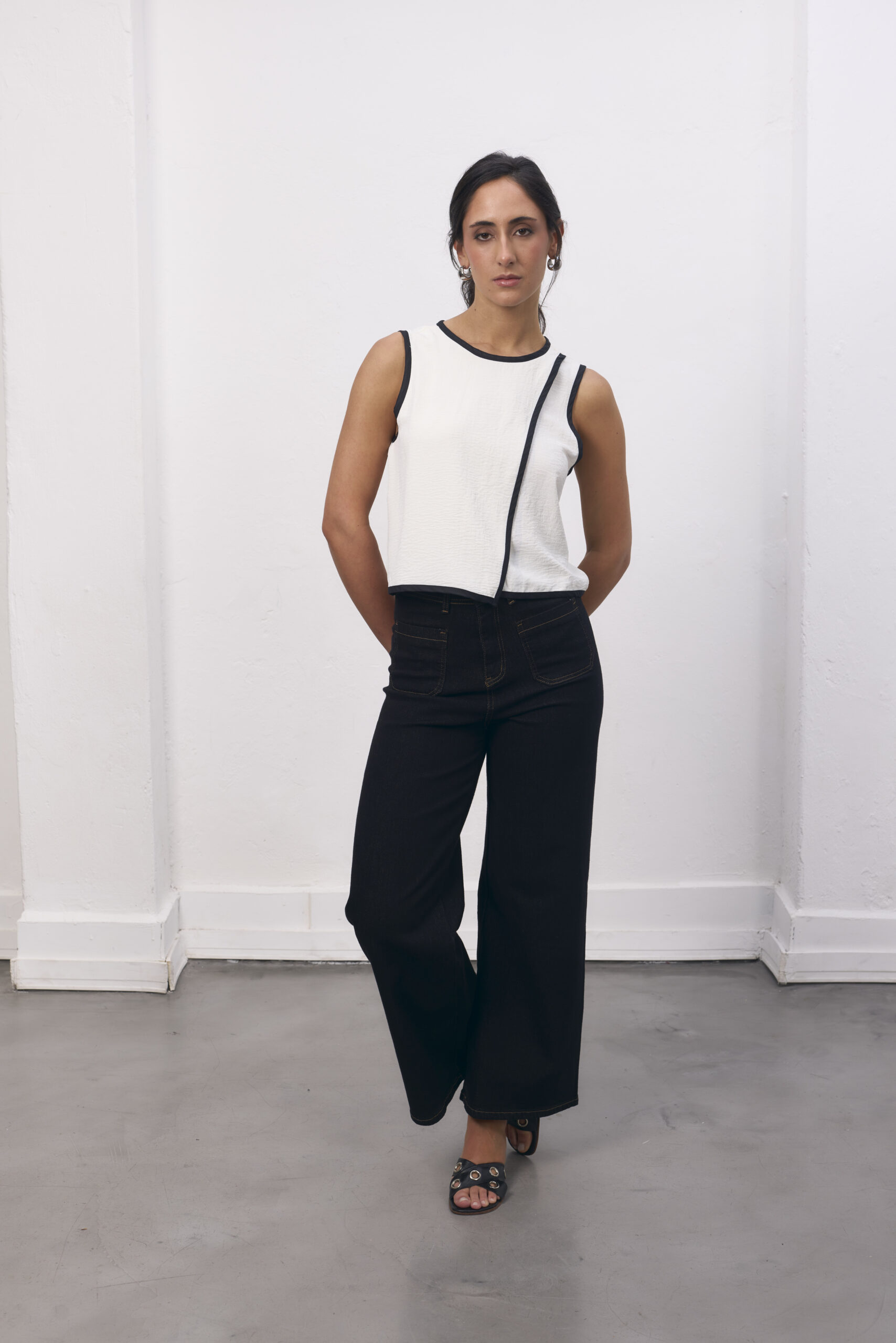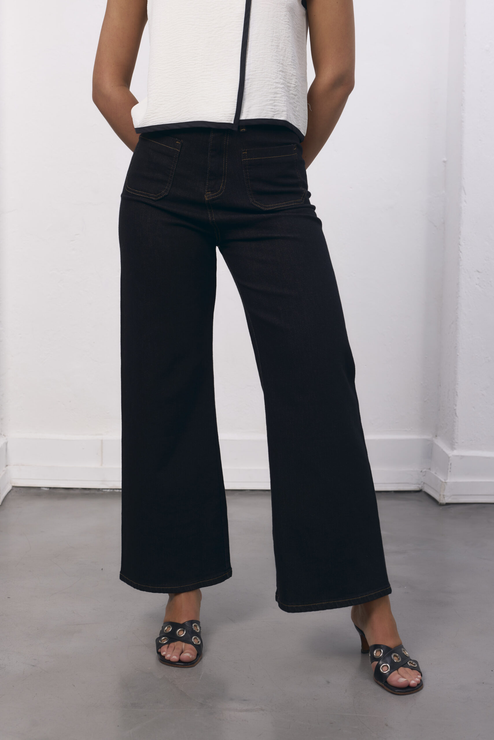 Jean negro tiro alto, recto con bolsillos delanteros.
