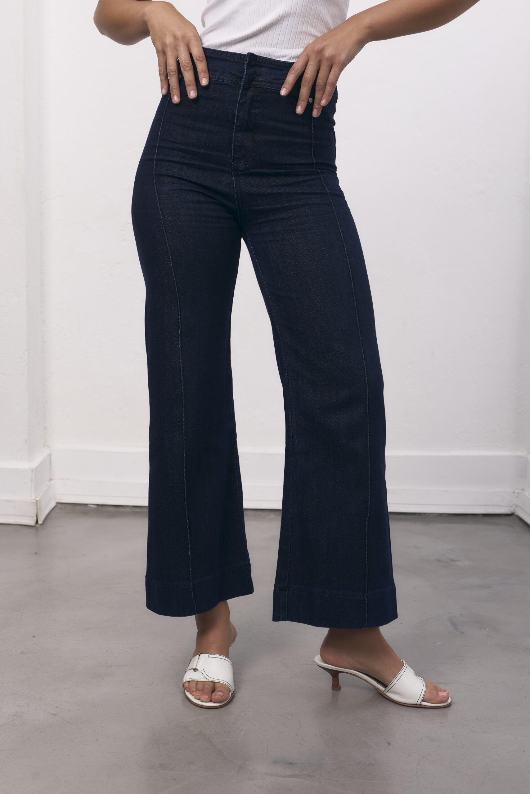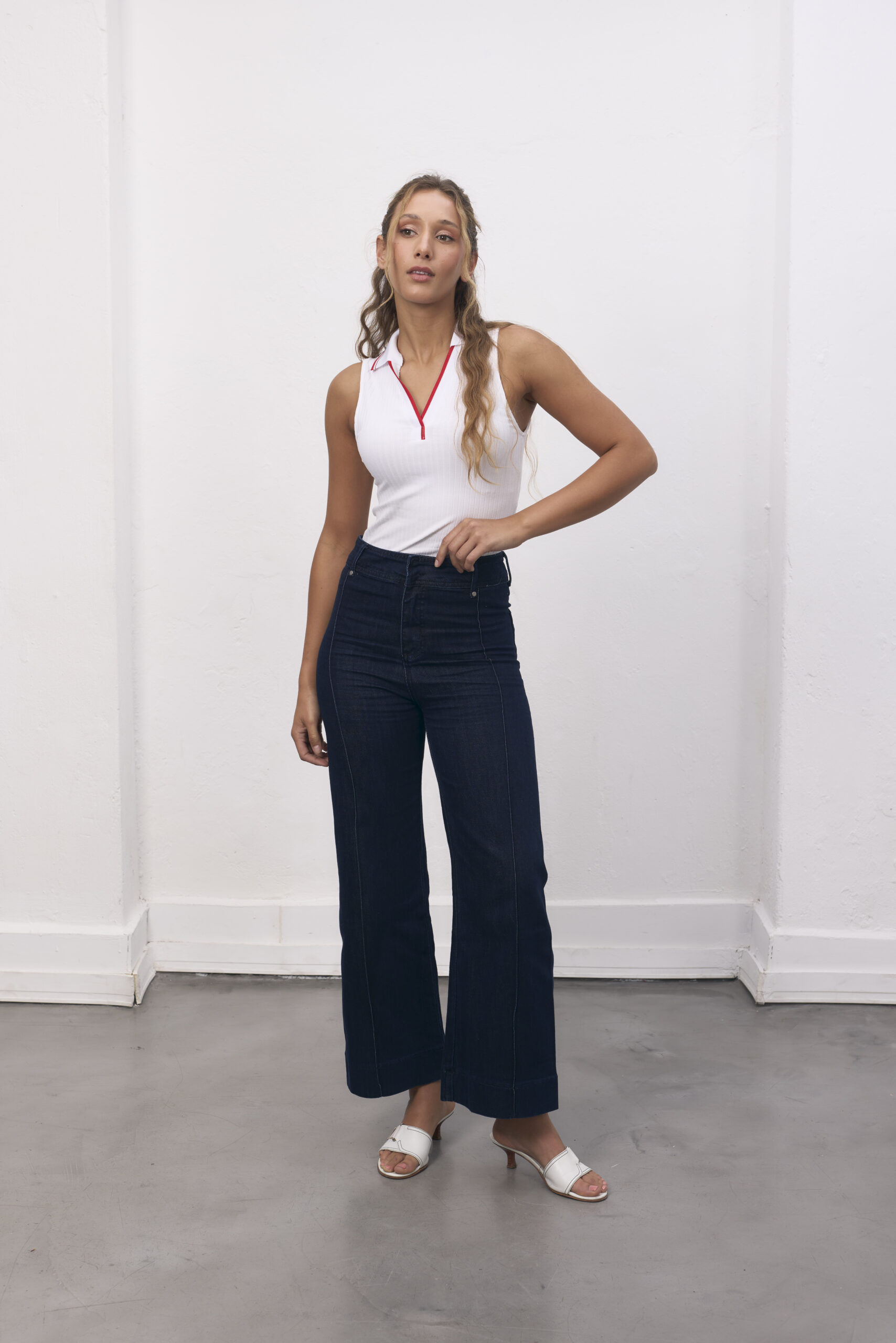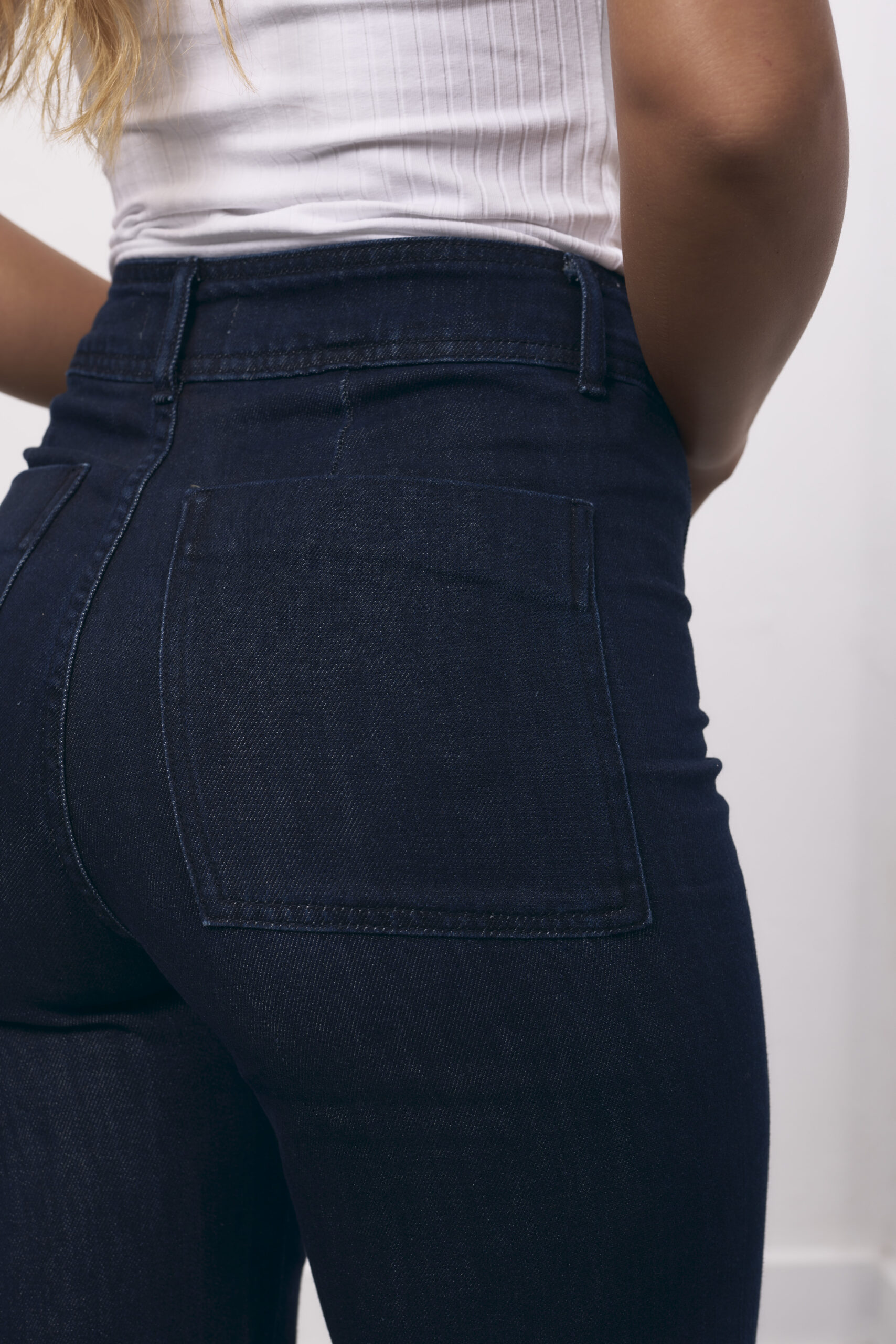 Jean azul tiro alto, pierna acampanada con costura delantera.