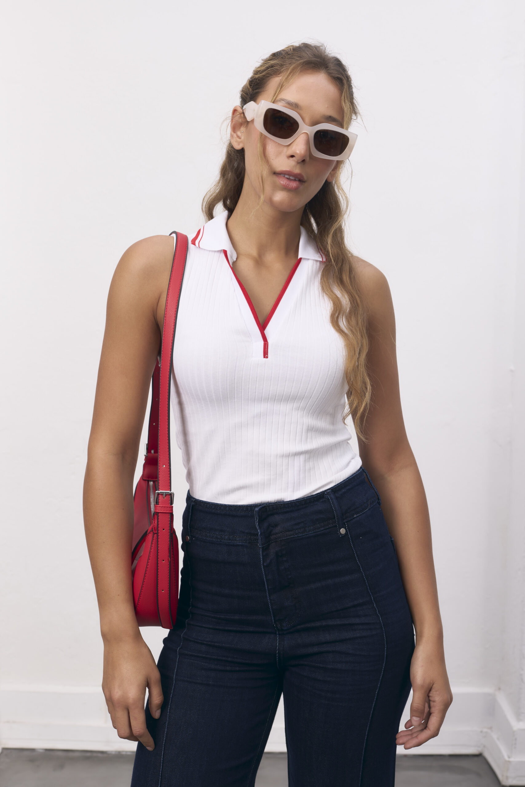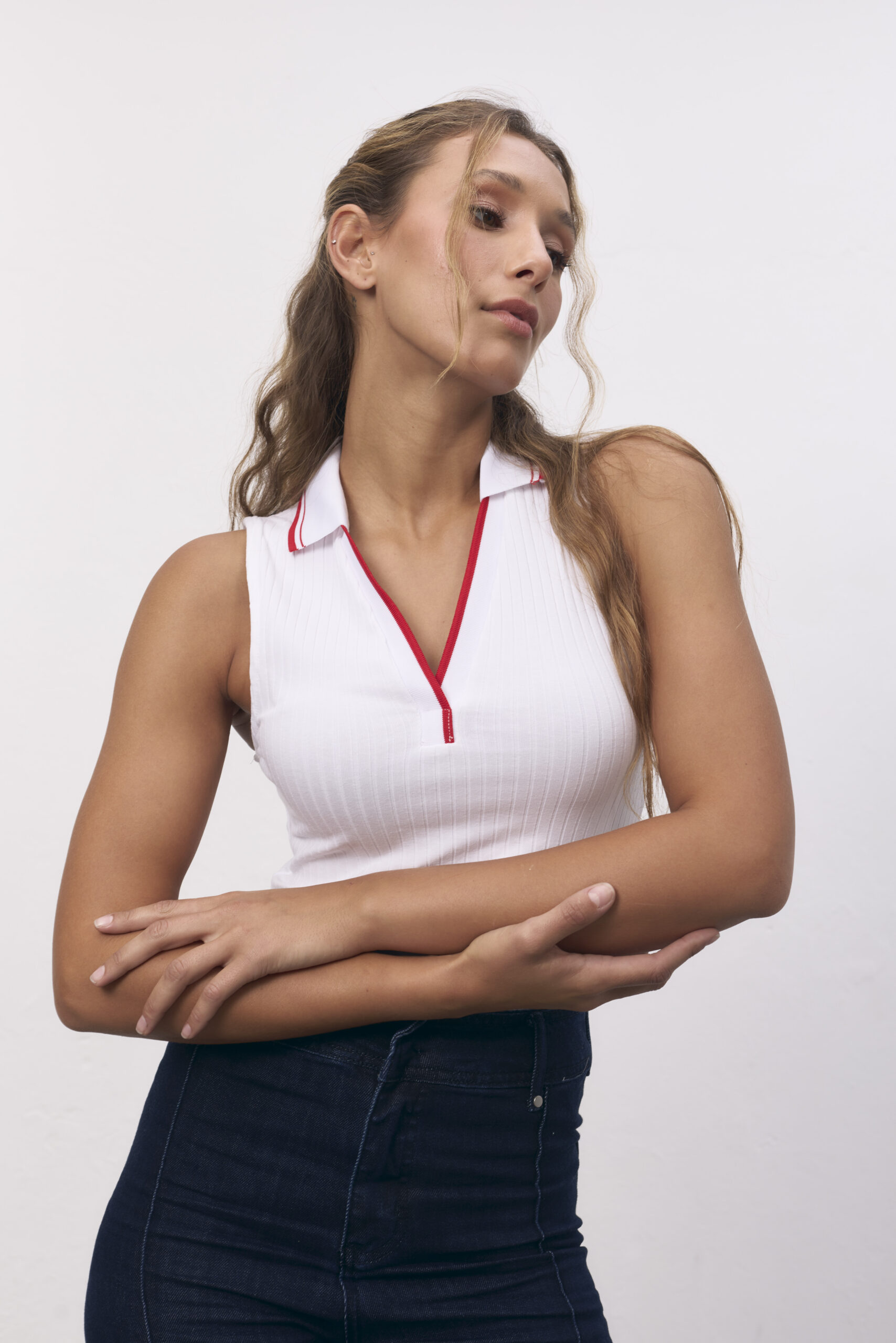 Musculosa blanca y roja con cuello polo.