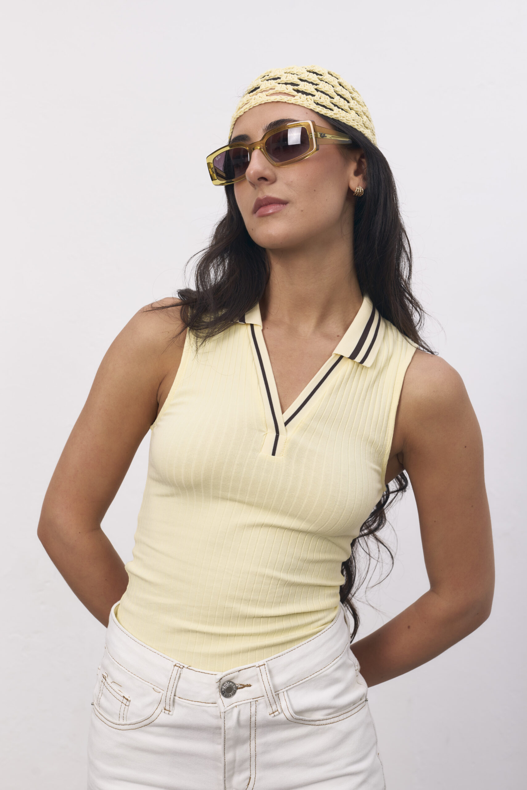 Musculosa amarilla y marrón con cuello polo.