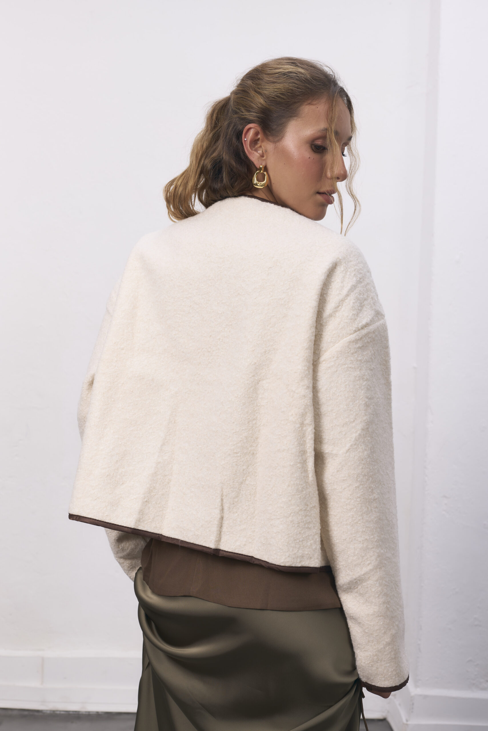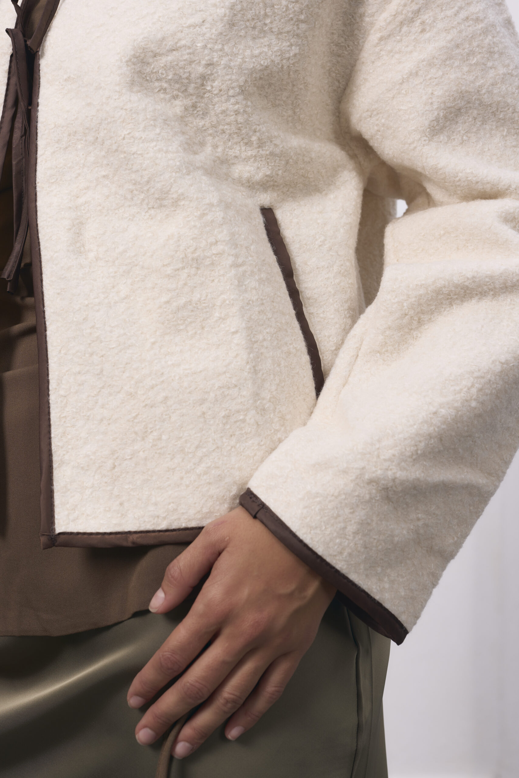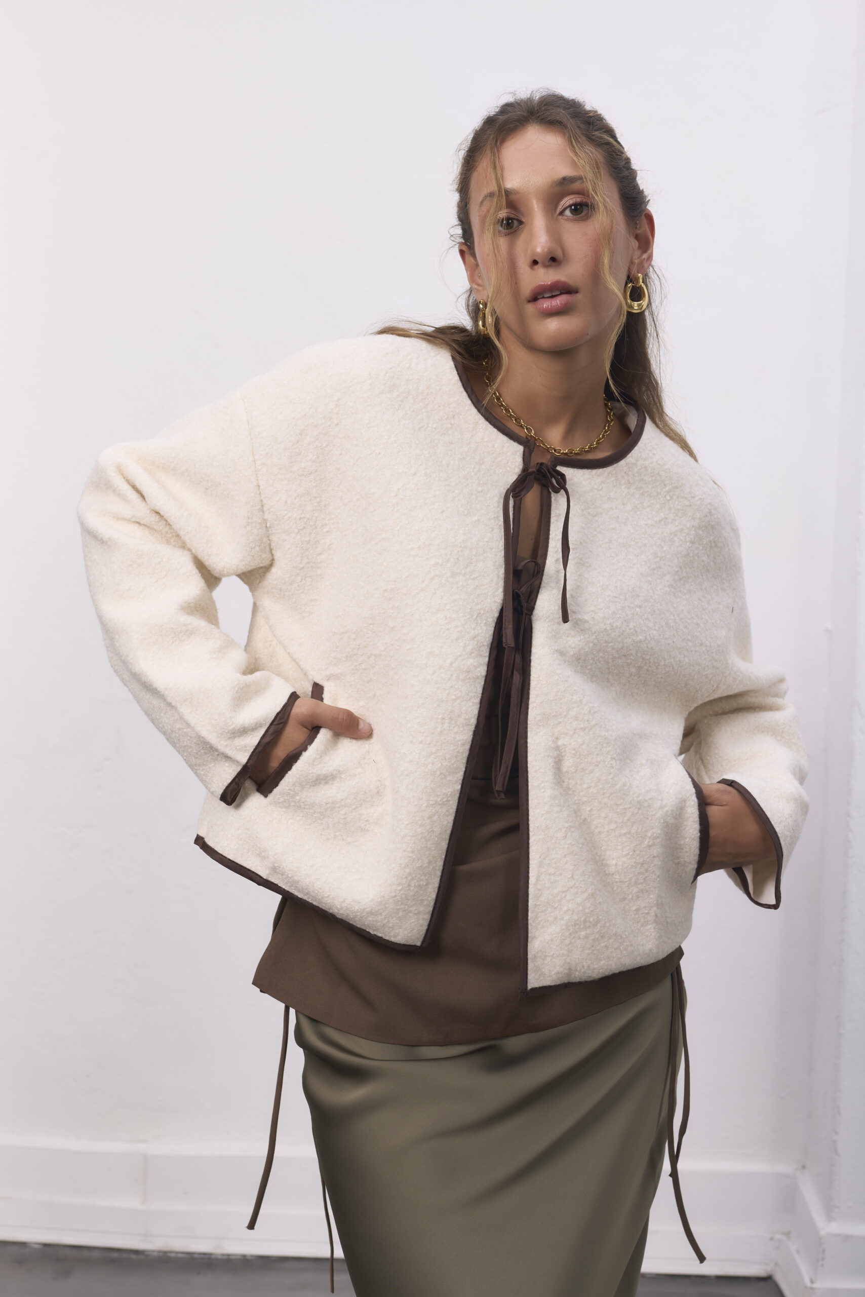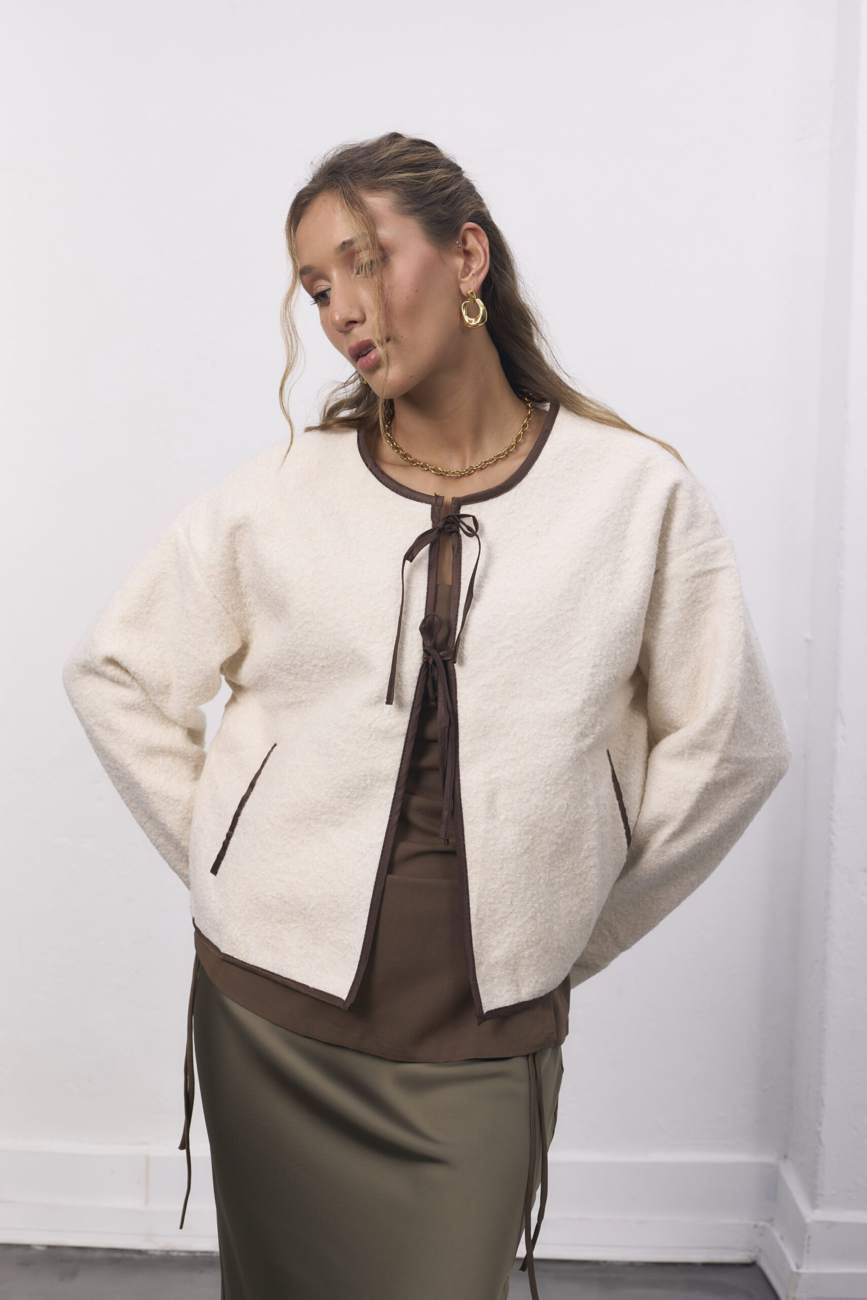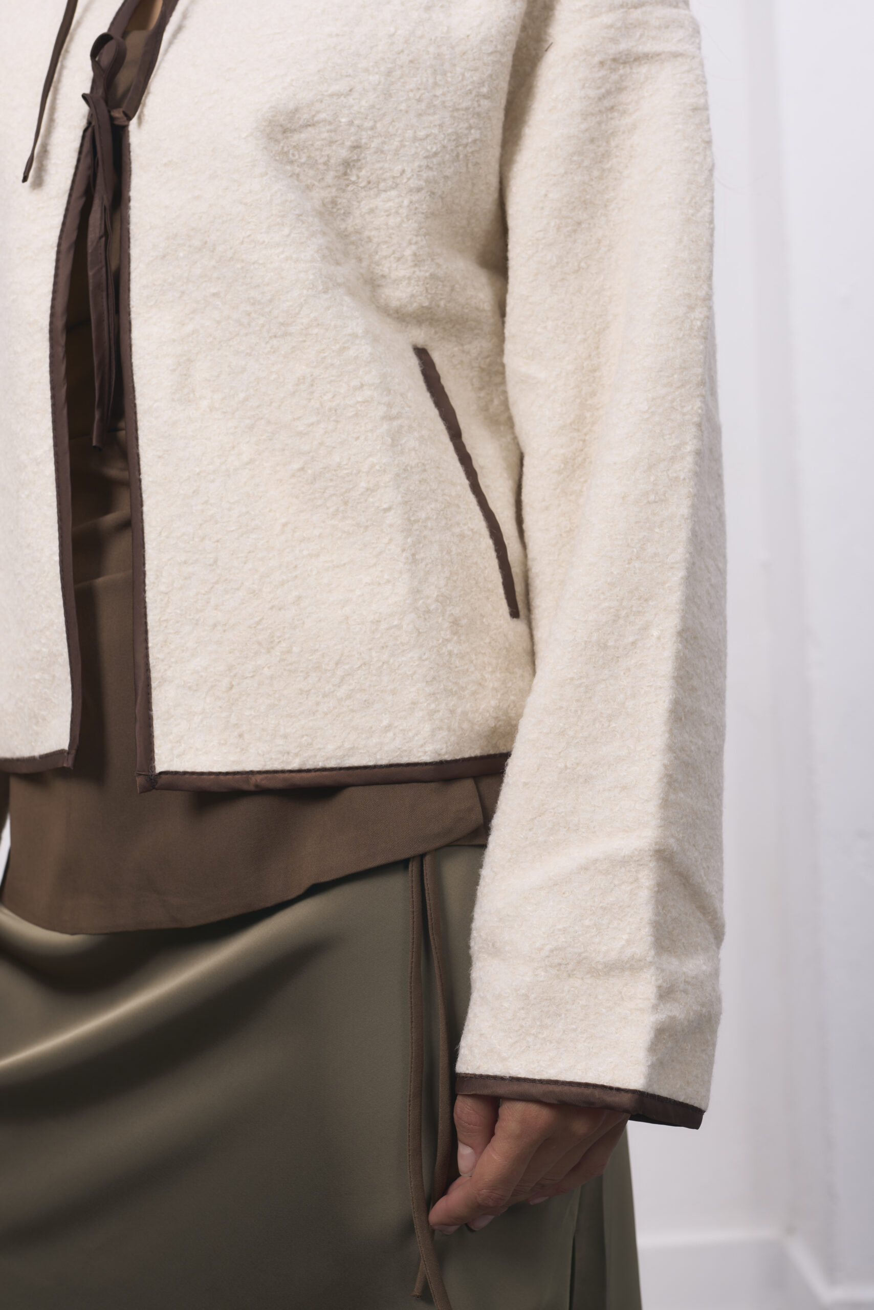 Chaqueta minimalista en tono neutro con lazo fino y mangas largas.
