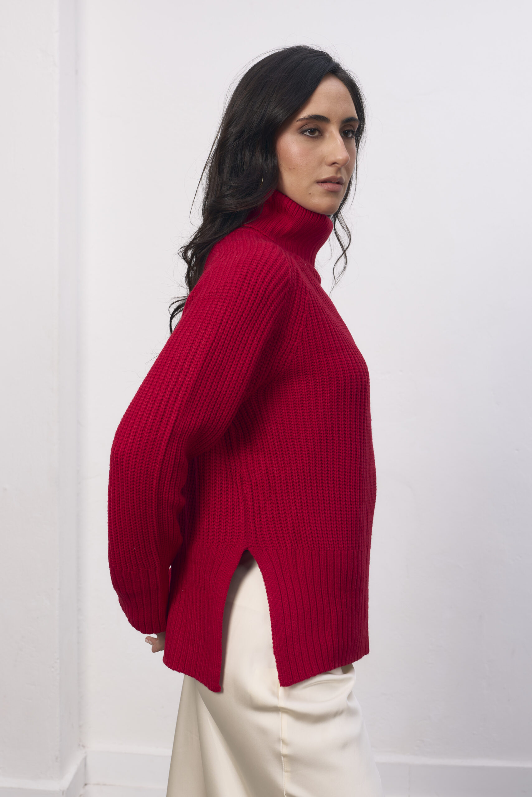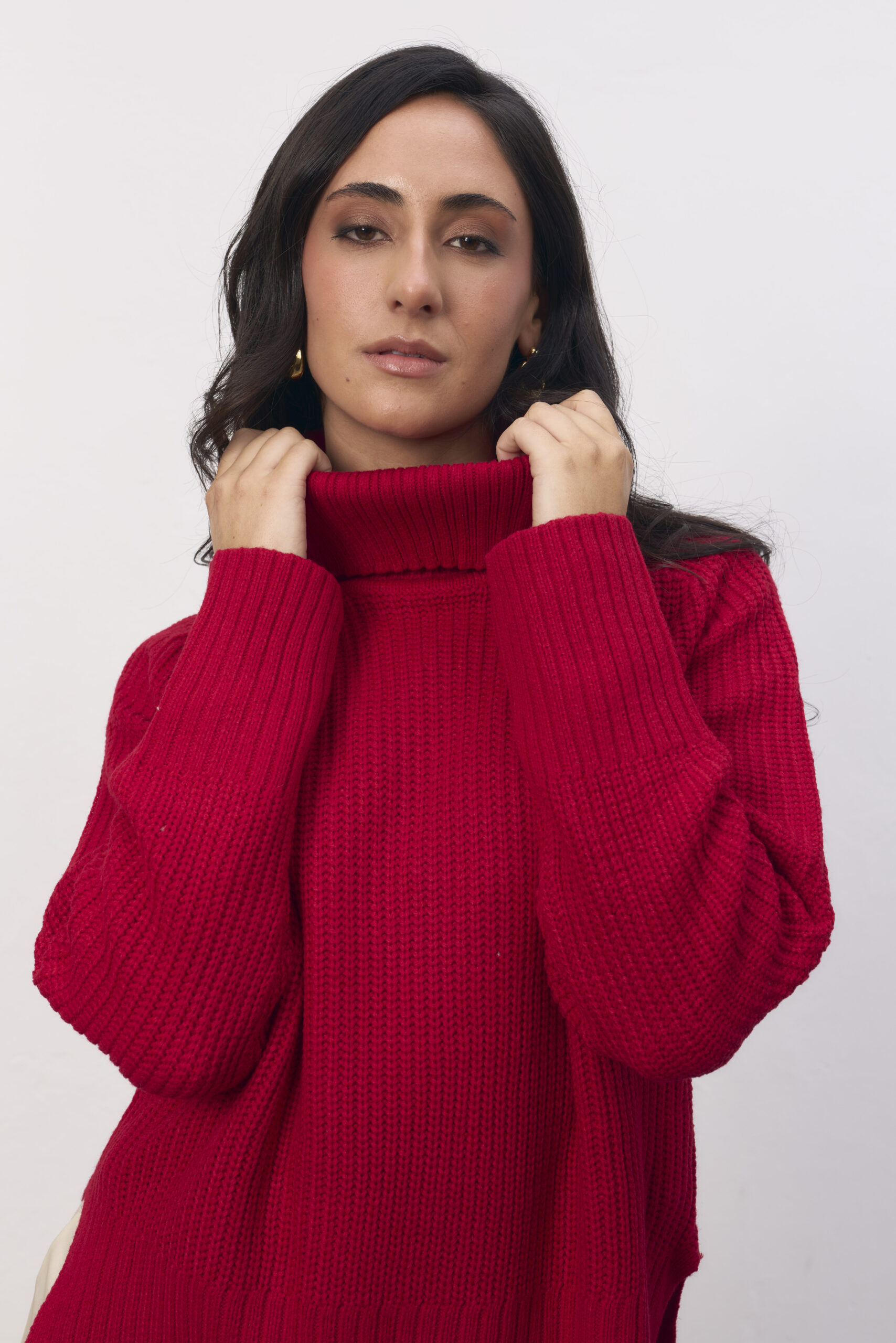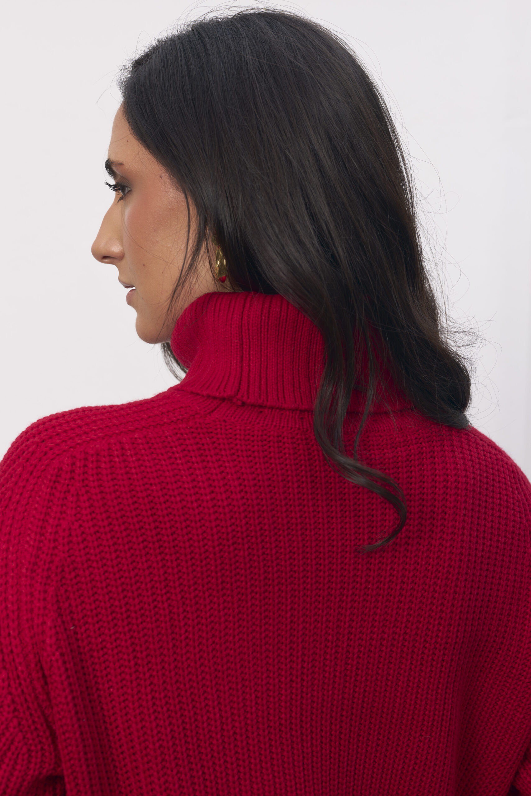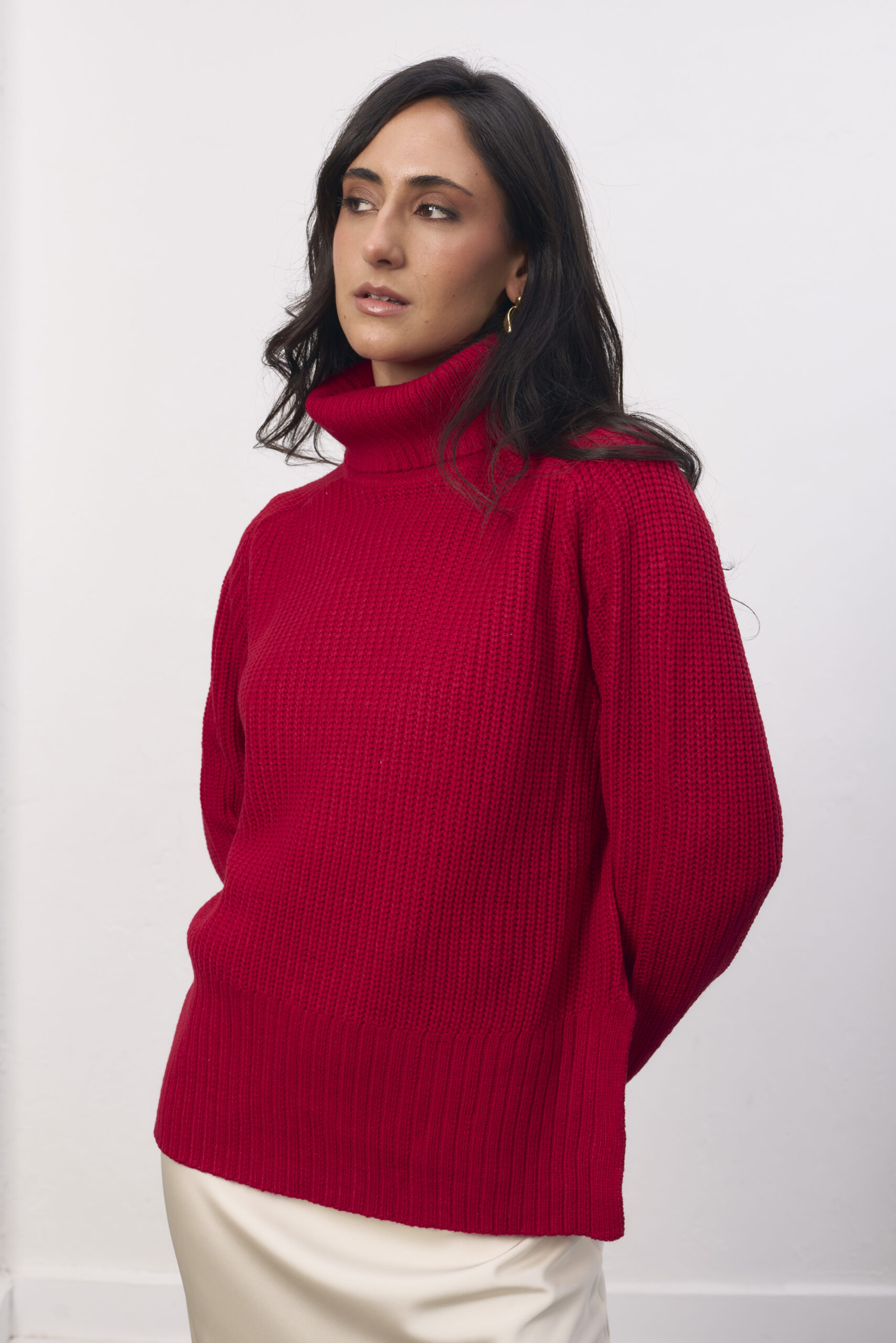 Sweater tejido en tono rojo con cuello alto y silueta recta.