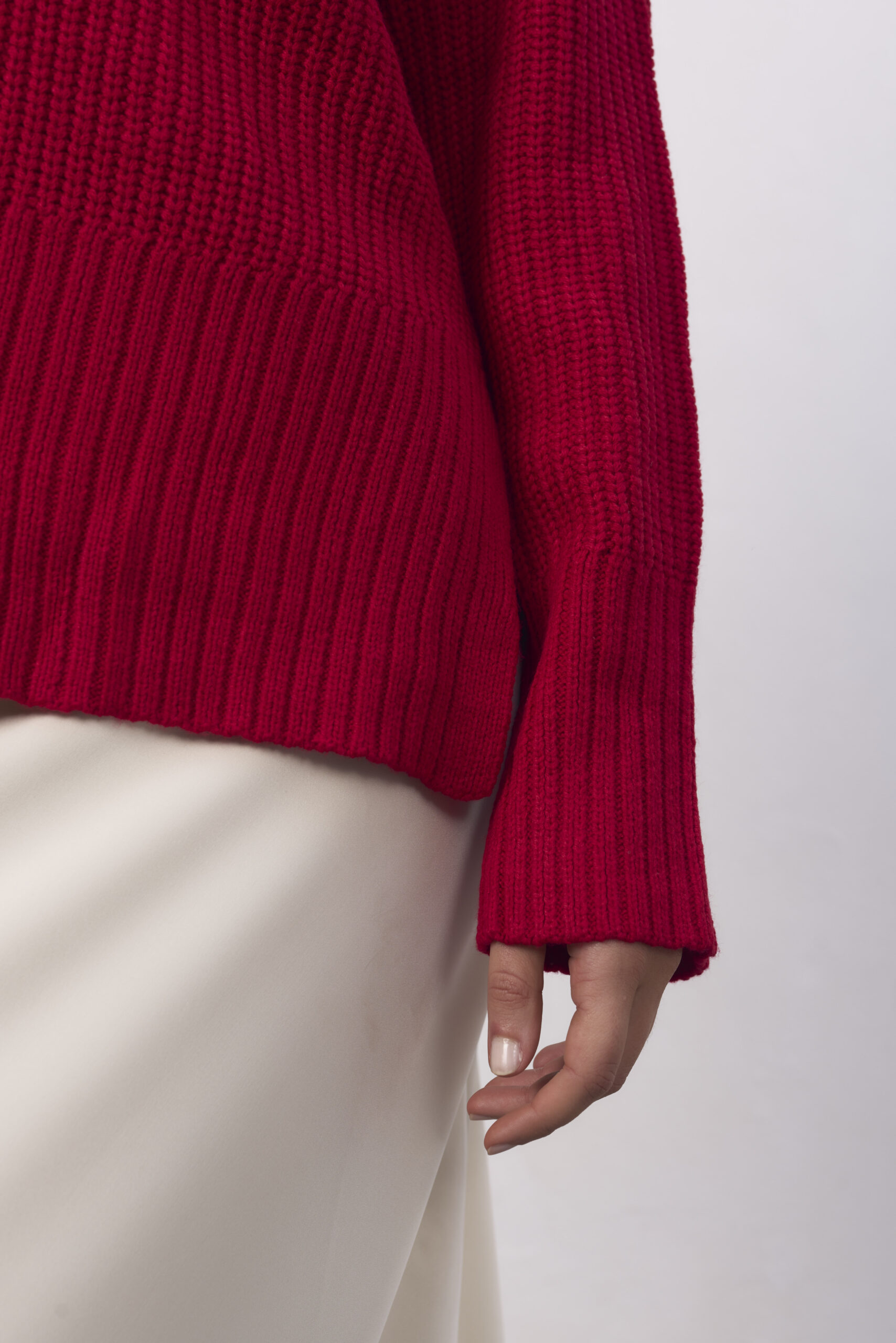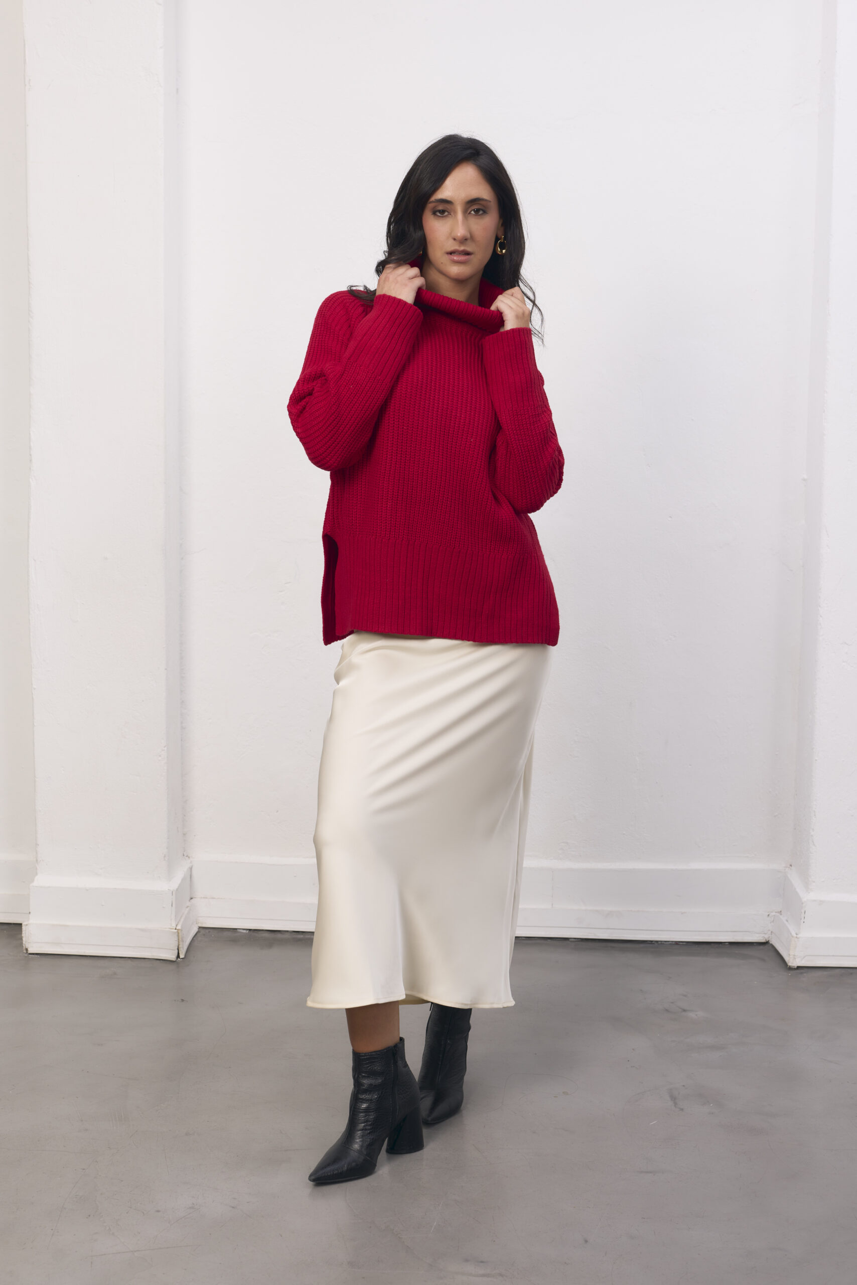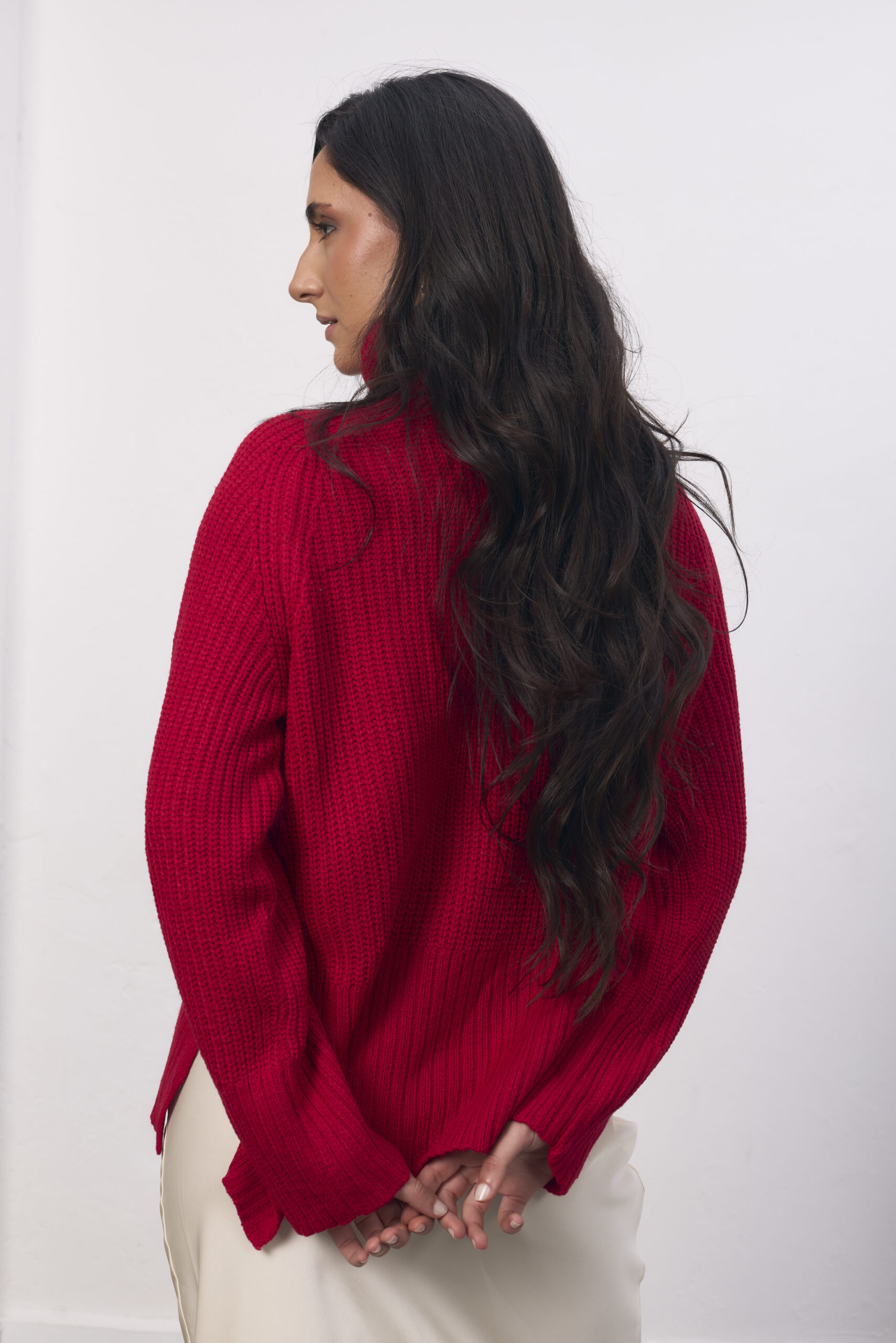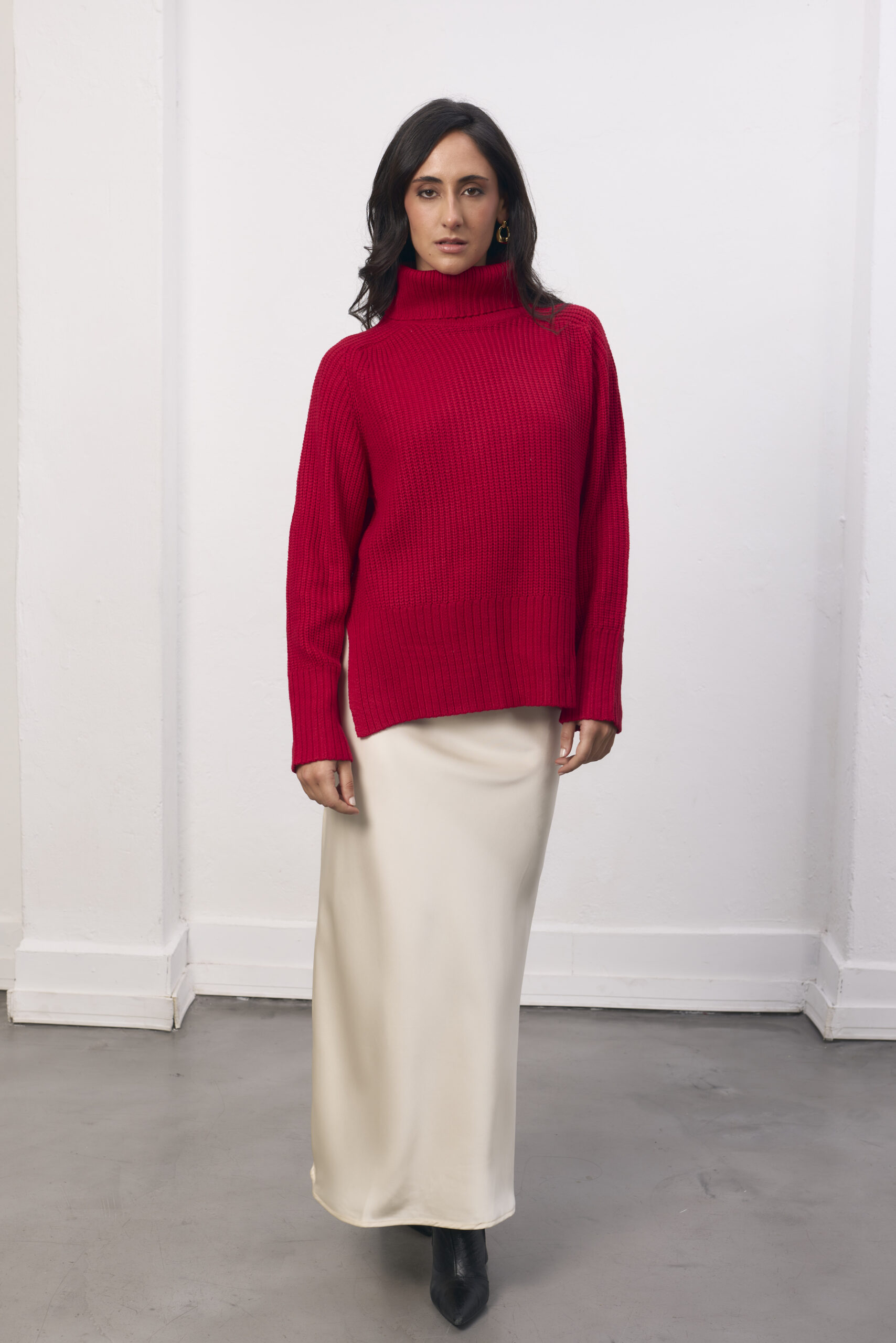 Sweater tejido en tono rojo con cuello alto y silueta recta.