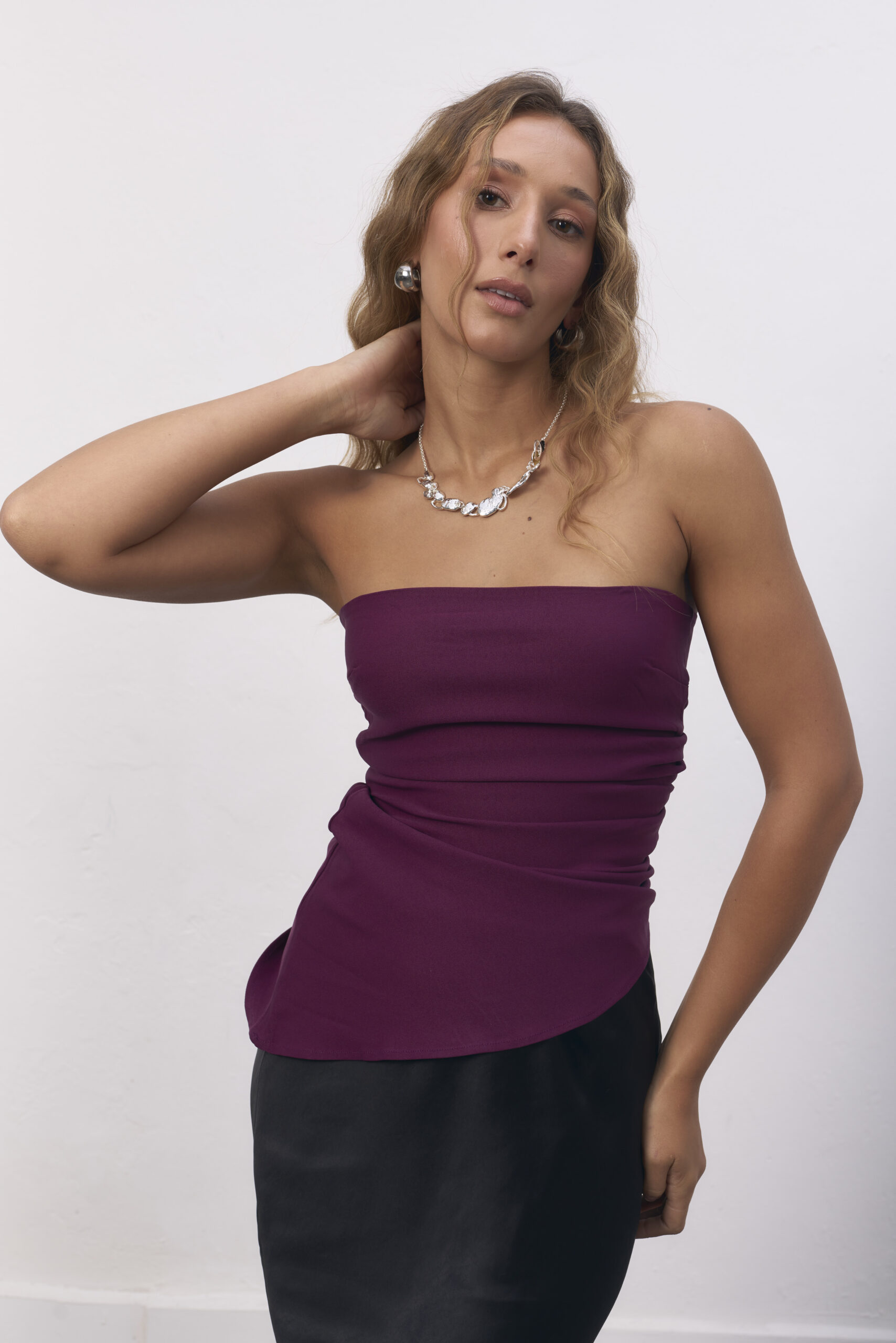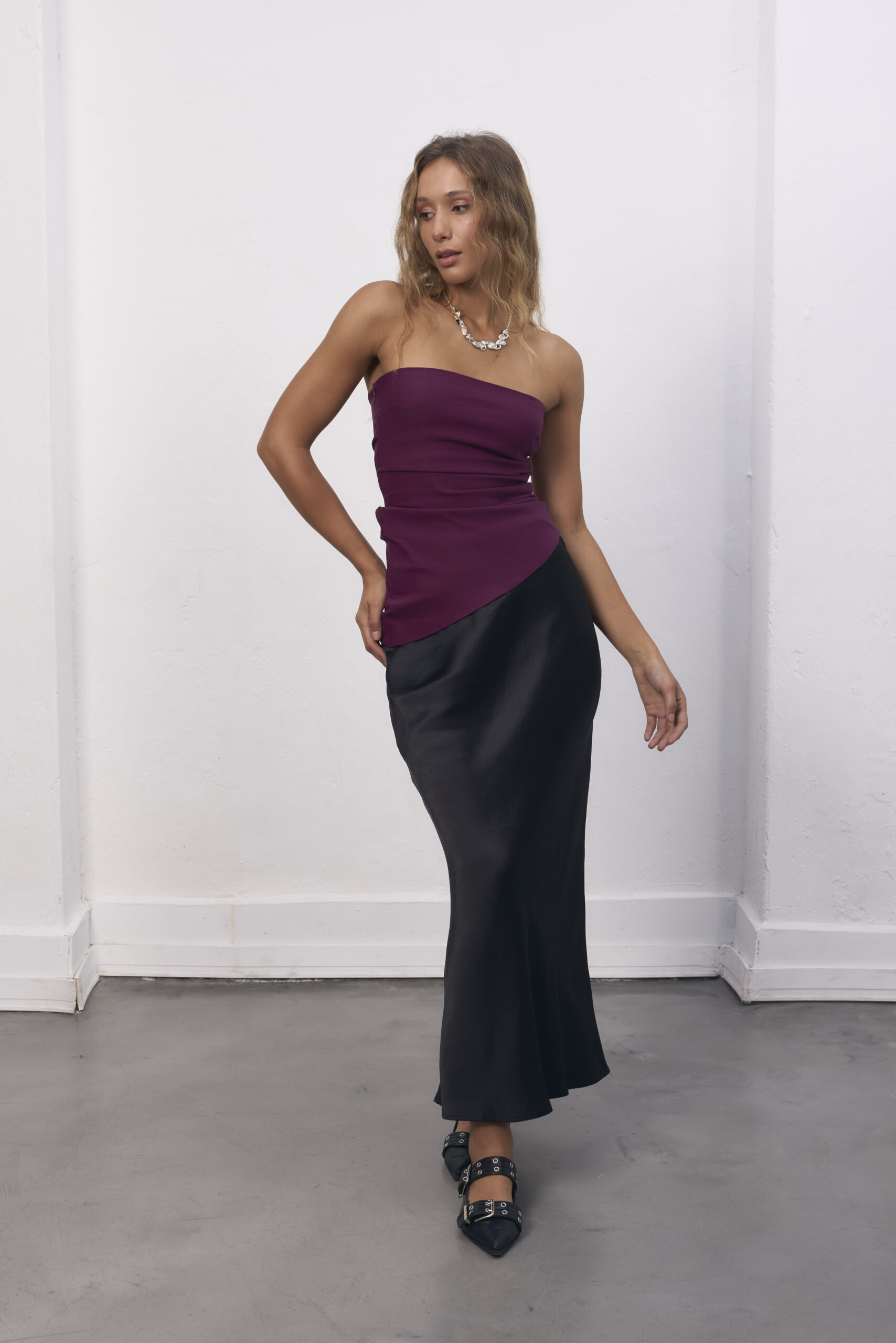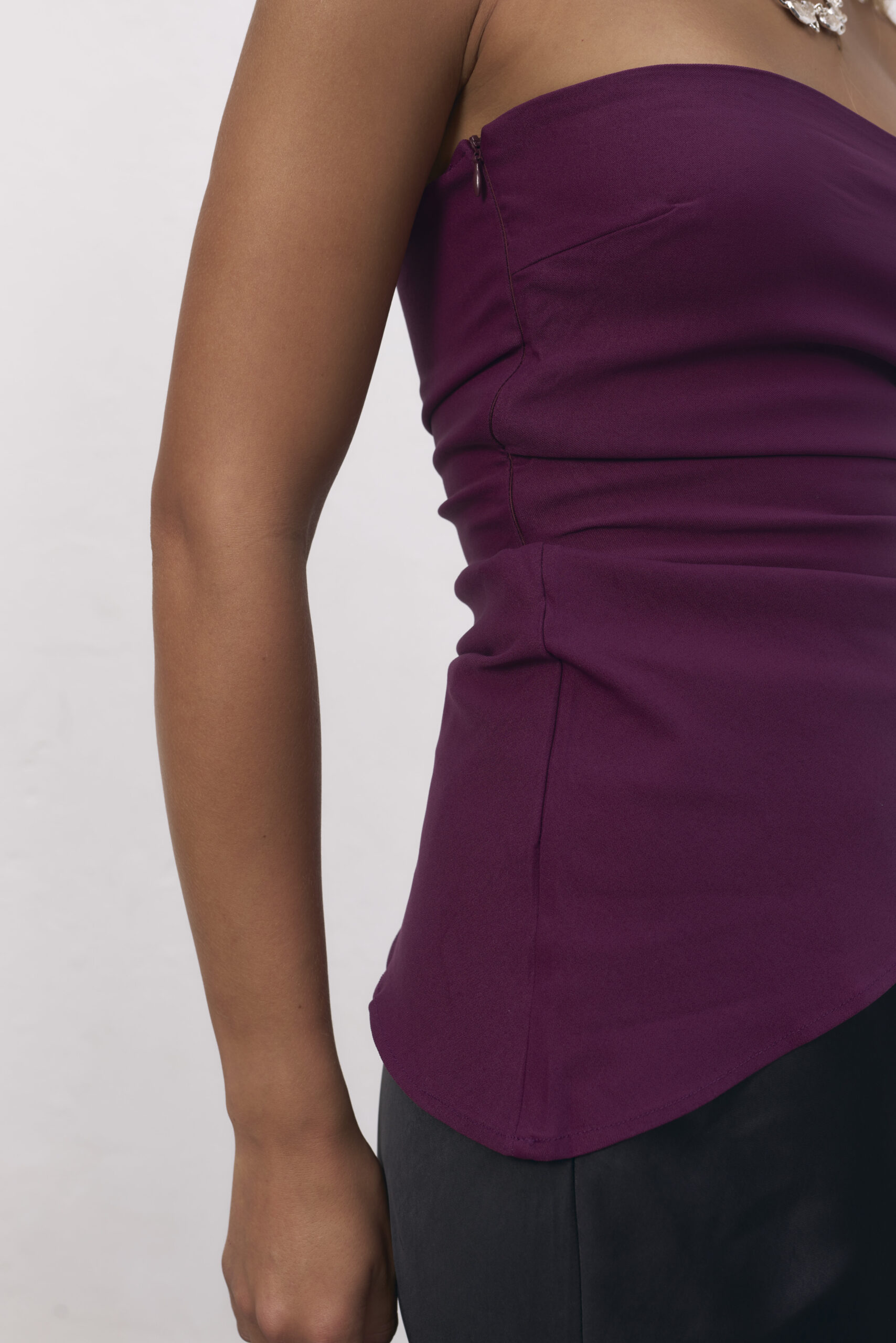 Strapless violeta con corte asimétrico.