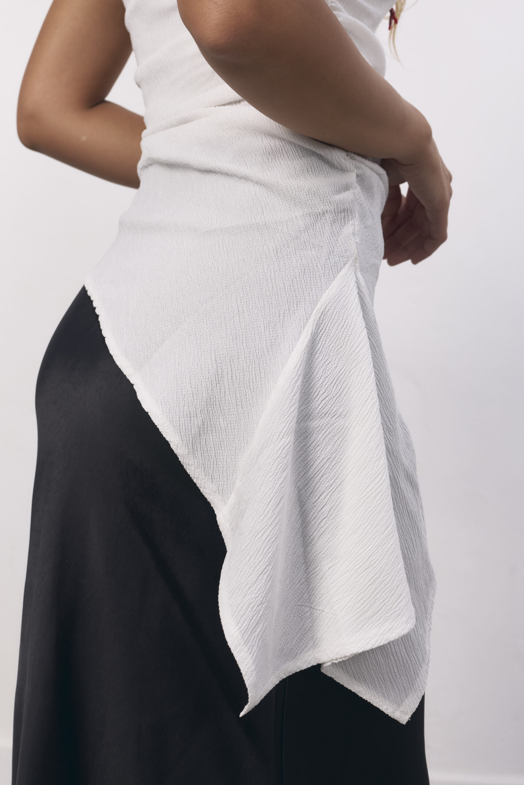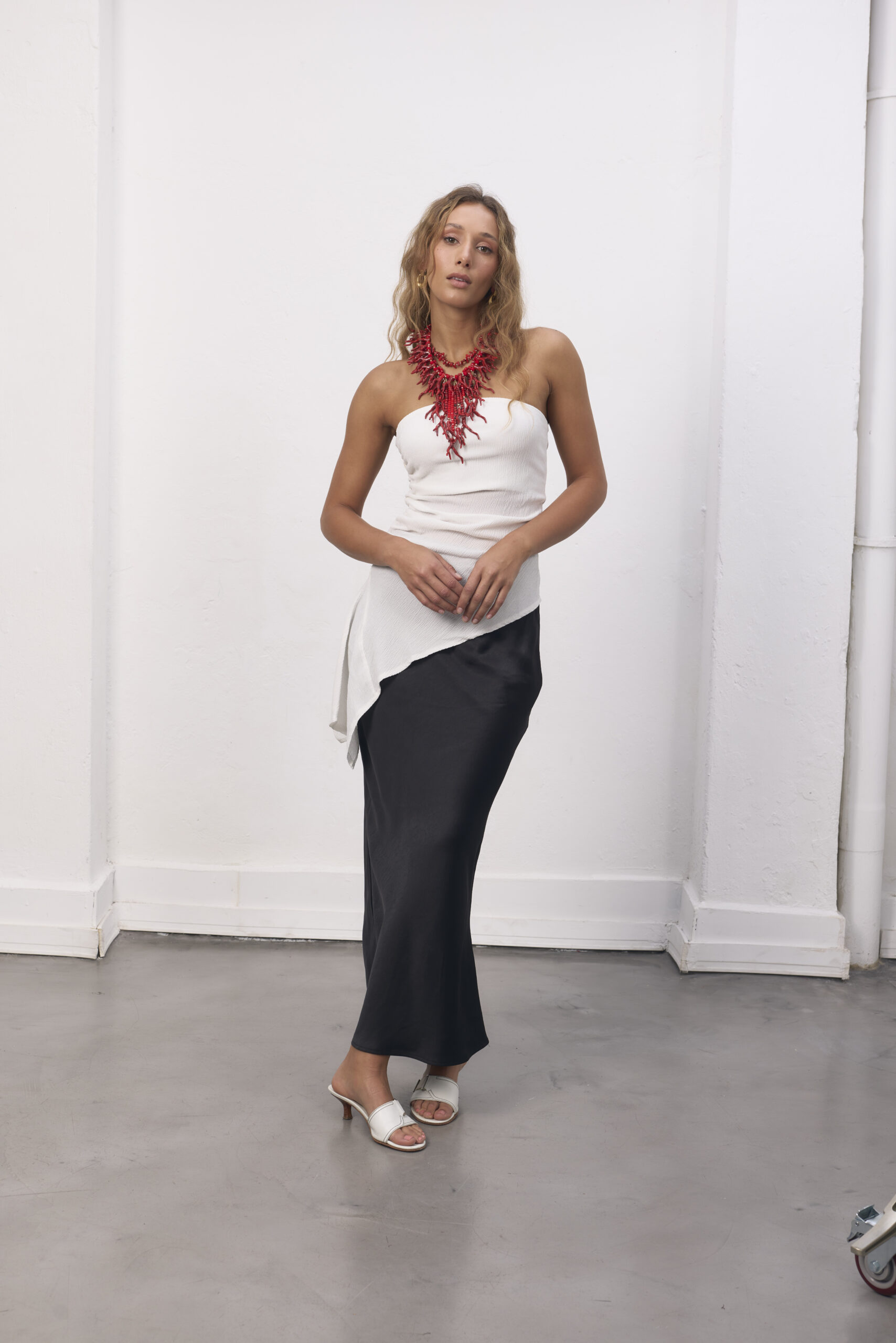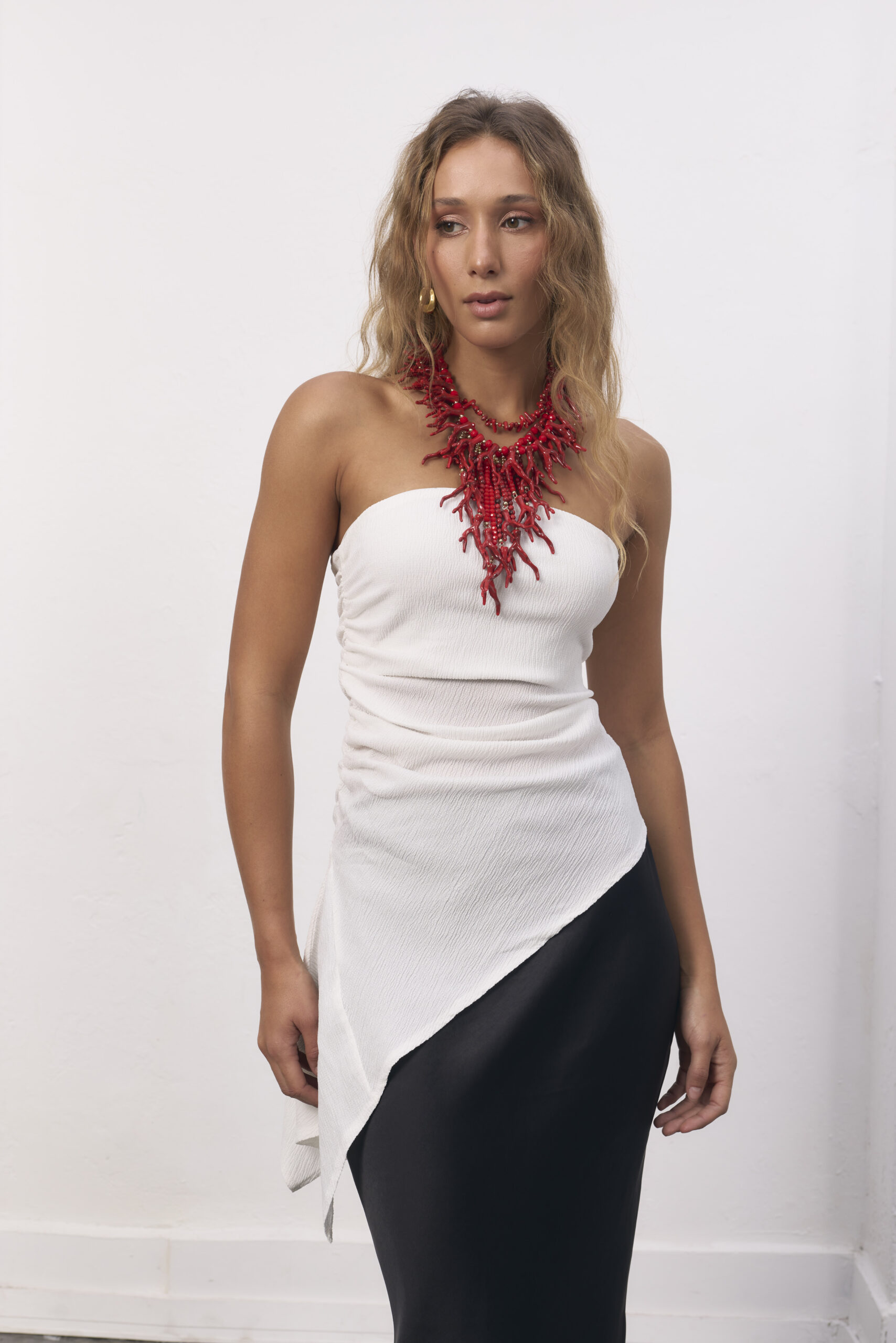 Top strapless blanco con acabado asimétrico.